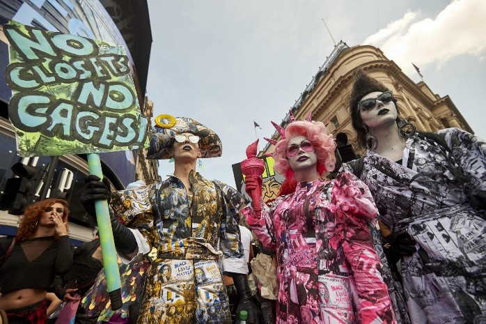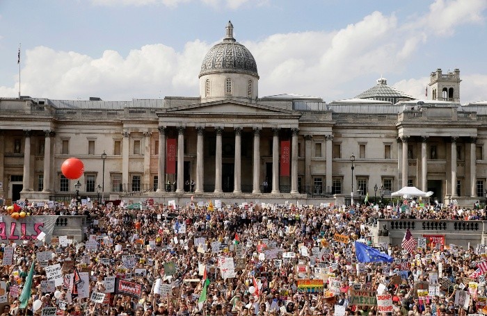 El globo gigante de un "bebé Trump" en pañales y sujetando un celular se alzó hoy enfrente del Parlamento de Londres, como parte de las protestas por la primera visita oficial al Reino Unido del presidente estadounidense, Donald Trump.La figura, de seis metros de altura y que representa a un bebé enfadado, sobrevoló hoy durante dos horas las inmediaciones del Parlamento de Westminster a iniciativa del colectivo Nona Hurkmans.El alcalde de Londres, el laborista Sadiq Khan, defendió hoy su decisión de autorizar el vuelo del "bebé Trump", criticado por los conservadores, al afirmar que no es su papel "ejercer de censor" o determinar si una protesta es "de buen o mal gusto".Las mujeres y los colectivos LGBT congregaron a miles de manifestantes que protestaron en Londres contra la visita de Trump.La plataforma Women's March London organizó la primera de las movilizaciones convocada esta jornada cerca del mediodía en Regent's Street, en el centro de la capital británica, y que concluyó en la plaza del Parlamento.La organización convocante prevé la participación de hasta 50 mil personas en este acto contra las políticas y los comentarios "machistas" y "homófobos" de Trump.Las fuerzas del orden esperan que, entre todas las convocatorias de la ciudad de Londres, se lleguen a concentrar hasta 100 mil personas.Personas disfrazadas de pollo o de las sirvientas de la serie "The Handmaid's Tale" y proclamas como "Trump apesta" o "No a Trump, no a la guerra" se vieron en la movilización -convocada a nivel nacional por la coalición Together Against Trump (Juntos contra Trump), promovida por el periodista Owen Jones.Los inconformes se concentraron después del mediodía local en el centro de la capital británica y marcharon hasta la plaza de Trafalgar.Algunos llevaron mascarillas en la cara con el mensaje "Trump apesta" o pancartas como "Dejar a Trump" o "Trump adora el 'brexit'", simbolizado con un corazón en medio.Otros manifestantes acudieron vestidos de pollo, en señal de protesta ante un posible acuerdo comercial entre el Reino Unido y Estados Unidos.Si hacemos un acuerdo comercial post-'brexit' con Trump y EU, los estándares de higiene en la alimentación son muy bajos, lavan a sus pollos en cloro para limpiar enfermedades que nosotros no tenemos en los nuestros. Esto es un símbolo de lo que no queremos con Estados Unidos", dijo Liz Morris, una de las tantas mujeres así disfrazadas.Briony Thompson, otra de las participantes, declaró que Trump es "un misógino fascista y estúpido que debe ser parado"."El mundo se está convirtiendo en 'The Handmaid's Tale' y eso no es bueno (...) Si alzamos las suficientes voces y decimos que no está bien, quizá ocurra el cambio", agregó la joven en alusión a la serie de televisión -basada en la novela de Margaret Atwood- sobre un futuro distópico.IM