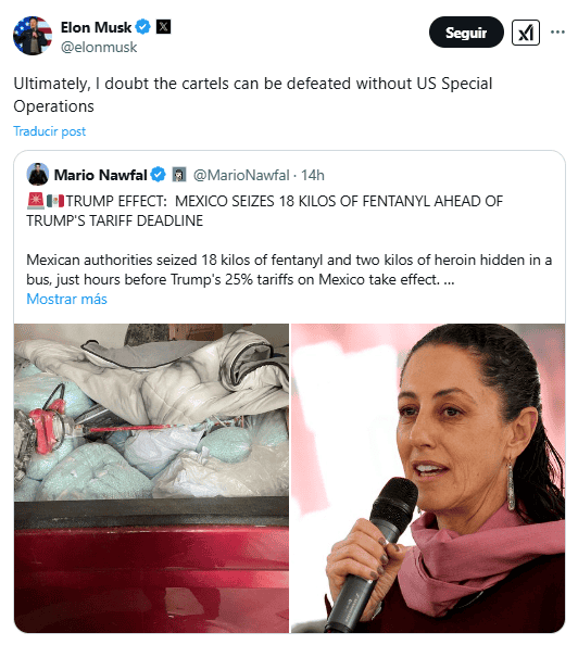 Ayer viernes 31 de enero, el secretario de Seguridad y Protección Ciudadana, Omar García Harfuch, informó sobre detenciones de personas y aseguramiento de droga en el estado de Sonora.En redes sociales, García Harfuch indicó que, resultado de acciones encabezadas por la Fiscalía General de la República (FGR), a través de la Agencia de Investigación Criminal en coordinación con el Gabinete de Seguridad, la Secretaría de la Defensa Nacional (Sedena), la Secretaría de Marina (Semar) y la Guardia Nacional (GN), detuvieron a dos hombres por transportar paquetes con aproximadamente 20 kilogramos de fentanilo y heroína en Sonora.Ante el hecho, el empresario Elon Musk reaccionó y dudó que los cárteles "puedan ser derrotados sin Estados Unidos"."En última instancia, dudo que los cárteles puedan ser derrotados sin las Operaciones Especiales de Estados Unidos", expresó el fundador de SpaceX y Tesla.Trump sostiene amenaza de arancel de 25% a MéxicoLa publicación se da en medio de amenazas por parte del presidente estadounidense, Donald Trump, quien confirmó el pasado jueves que aplicará aranceles de 25% a México y Canadá por el déficit comercial así como el tráfico de fentanilo y de migración irregular, tras indicar que concretará los detalles."Anunciaremos los aranceles sobre Canadá y México por varias razones. La primera es la gente que llega a nuestro país de manera tan horrible y en tanta cantidad", dijo en un acto de firma de órdenes ejecutivas en la Casa Blanca.La segunda razón, añadió, es la llegada de fentanilo "y de todo lo demás que ha entrado en el país". Y en tercer lugar, los subsidios "masivos" que en su opinión Estados Unidos otorga a México y Canadá "en forma de déficit".*Mantente al día con las noticias, únete a nuestro canal de WhatsAppOF