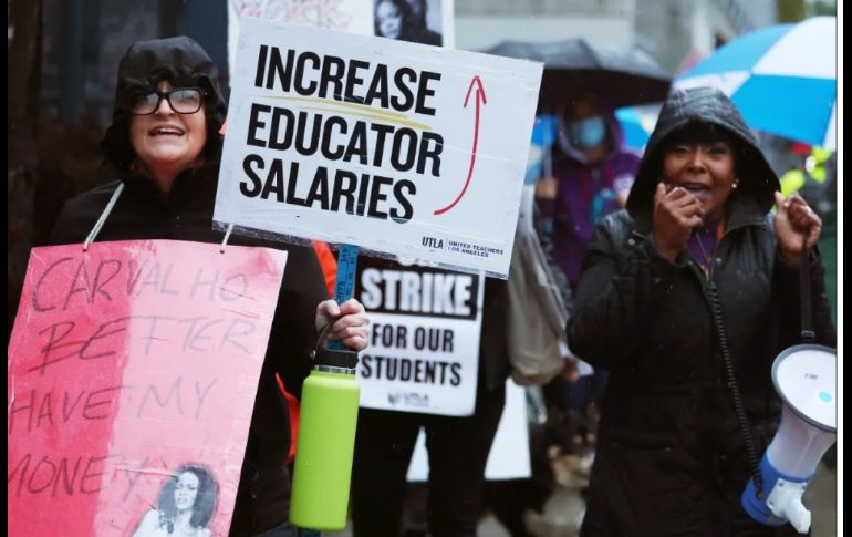 Más de 420 mil alumnos del Distrito Escolar de Los Ángeles, el segundo más numeroso de EU, se quedaron este martes en sus casas durante la primera jornada de una huelga de tres días convocada por personal de centros educativos públicos, quienes piden mejores salarios y condiciones de trabajo.Conductores de autobús, conserjes, asistentes de estudiantes con necesidades especiales y trabajadores de cafetería de 1.000 colegios del área metropolitana angelina exigen un aumento salarial del 30% y un extra de 2 dólares más por hora para los empleados peor pagados.Agrupados en la sección Local 99 del Sindicato Internacional de Empleados de Servicios (SEIU, en inglés), los 30 mil trabajadores en huelga consideran necesaria una subida para hacer frente al incremento del coste de vida experimentado en la ciudad durante los últimos años.Local 99 negoció sin éxito con el Distrito Escolar hasta última hora de la tarde de ayer después de haberse sentando juntos también la semana pasada, cuando llegó la mejor y última oferta: un aumento acumulativo del 23% sobre las nóminas de los trabajadores desde 2020."El Distrito Escolar nos consideró trabajadores esenciales durante la pandemia, pero parece que se les ha olvidado", afirmó Conrado Guerrero, presidente de Local 99, durante una marcha celebrada este martes en el centro de Los Ángeles donde añadió que actualmente "las negociaciones están estancadas".Por su parte, el superintendente del Distrito Escolar, Alberto Carvalho, emitió un comunicado hoy en el que señaló que buscarán retomar el diálogo, pero hizo hincapié en que la propuesta de la semana pasada ya era una "oferta histórica" que reconocía "los grandes sacrificios de este grupo de empleados".Las escuelas del distrito escolar en huelga sirven 300 mil desayunos y 285 mil almuerzos a estudiantes latinos y afroamericanos de las comunidades menos favorecidas, quienes recibirán los alimentos en 24 puntos de la ciudad organizados por el Ayuntamiento para atender sus necesidades mientras dure el corte de las clases.El gremio Profesores Unidos de Los Ángeles (UTLA, en inglés), que reúne a 35 mil maestros, mostró su solidaridad y también se ha sumado a este paro, mientras negocian un aumento salarial del 20% en dos años, comenzando con un 10% para el curso vigente.Los miembros de SEIU llevan trabajando sin contrato desde junio de 2020 y el convenio de los profesores expiró en junio de 2022.La huelga actual supone la interrupción más larga de la actividad en las aulas del segundo sistema escolar del país después del paro de 6 días que llevaron a cabo los docentes en 2019.CR