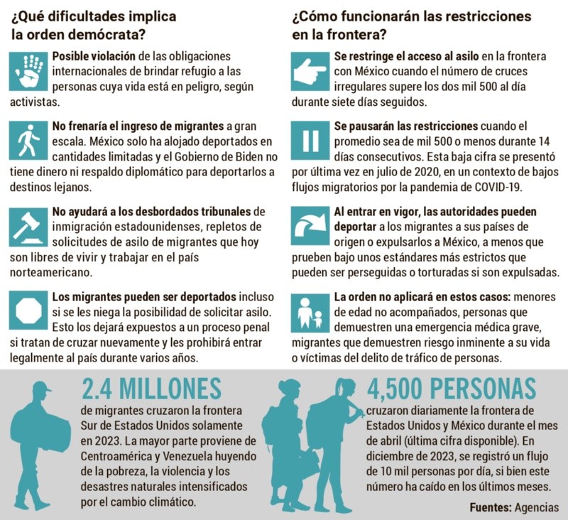 Estados Unidos endurece su política migratoria. El presidente de ese país, Joe Biden, firmó una orden ejecutiva o decreto para restringir drásticamente las solicitudes de asilo de migrantes indocumentados que crucen la frontera con México, así como facilitar las deportaciones a nuestro país. El mandatario demócrata anunció el cierre temporal de la frontera con México cuando la cifra de entradas irregulares a la Unión Americana supere el umbral de dos mil 500 casos en un mismo día. Si se rebasa ese tope, las autoridades suspenderán la entrada de solicitantes de asilo y migrantes. Según Biden, esta orden es necesaria “para asegurar nuestra frontera” y entrará en vigor de inmediato, pues los cruces de migrantes ilegales ya superan el umbral de los dos mil 500 por día -las estimaciones son de cuatro mil cruces diarios-. La orden migratoria responde a las políticas de deportación masiva que promete el ex mandatario y precandidato presidencial del Partido Republicano, Donald Trump, a seis meses de las elecciones presidenciales de Estados Unidos en las que Biden busca reelegirse. Además, es un posicionamiento de cara a los votantes, quienes han señalado en sondeos y encuestas que la migración es el tema clave de la elección.Ayer, Biden habló con Andrés Manuel López Obrador sobre la medida y prometió que “seguirá trabajando con nuestros vecinos mexicanos, en lugar de atacarlos”. La Unión Estadounidense de Libertades Civiles (ACLU, en inglés) informó que buscará tumbar en la Corte Suprema la orden ejecutiva presentada por el presidente Joe Biden, que restringe de manera drástica las solicitudes de asilo en la frontera de Estados Unidos (EU) con México. La orden, en vigor desde hoy, permitirá a las autoridades estadounidenses deportar a quienes no superen unos estrictos estándares de asilo cuando se supere la cifra de dos mil 500 cruces diarios en la frontera durante un promedio de siete días.En un comunicado, ACLU advirtió que demandará la orden que, según la organización, se “hace eco” de la prohibición de entrada emitida por el Gobierno de Donald Trump en 2018.“Tenemos la intención de impugnar esta orden ante los tribunales. Era ilegal cuando Trump lo hizo, y no es menos ilegal ahora”, dijo Lee Gelernt, subdirector del Proyecto de Derechos de los Inmigrantes de la ACLU. Deirdre Schifeling, directora política y defensa de la ACLU, advirtió que la iniciativa presentada no arregla “el fallido” sistema de inmigración y apresurará las deportaciones. “Instamos a la administración de Biden a cumplir su promesa de campaña de restaurar el asilo y movilizar los recursos necesarios para abordar los desafíos en la frontera. No es sólo algo moralmente sensato: es buena política”, añadió.La Agencia de la Organización de las Naciones Unidas para los Refugiados (Acnur) afirmó que está “muy preocupada” por las restricciones a la entrada de migrantes, e instó a Washington a reconsiderar su decisión y cumplir sus obligaciones internacionales.“Las nuevas medidas denegarán el acceso al asilo a muchas personas que necesitan protección internacional y que ahora estarán sin una opción viable para buscar seguridad”, añadió la agencia de la ONU, que recordó: “cualquier persona que alegue tener temores fundados a ser perseguida en su país de origen debe tener acceso a un territorio seguro”. Para Angélica Salas, directora de la Coalición por los Derechos Humanos de los Inmigrantes, la iniciativa es un daño irreversible para los solicitantes de asilo. Agencias Con la orden restrictiva en la frontera mexicana, Joe Biden trata de virar su política migratoria después de que los sondeos de opinión revelaran que este asunto tendrá mucho peso para conseguir la reelección en su revancha contra el magnate y expresidente republicano Donald Trump (2017-2021).El equipo de campaña de Trump desestimó en un comunicado esta iniciativa al considerar que no está diseñada “para la seguridad fronteriza”, y repitió el mensaje del republicano que constantemente insiste en que los inmigrantes irregulares son responsables del aumento de los delitos violentos en Estados Unidos, acusación sin base en datos oficiales.El magnate pasó su mandato anunciando su intención de construir un muro en la frontera con México e intensificó su retórica antinmigración para regresar a la Casa Blanca.“Millones de personas han ingresado en nuestro país, y ahora, después de casi cuatro años de su liderazgo débil y fallido, su liderazgo patético, el corrupto Joe Biden pretende finalmente hacer algo respecto a la frontera”, exclamó Trump, de 77 años, en un video publicado en su red Truth Social.El presidente de la Cámara de Representantes, Mike Johnson, aliado de Trump, rápidamente calificó la medida de Biden como de “escaparate”.Sin embargo, la Casa Blanca ha resaltado que Biden intenta hacer frente a un sistema de inmigración “fallido desde hace décadas” y culpa a los republicanos en el Congreso por no cooperar y bloquear una partida de miles de millones de dólares para políticas fronterizas.Los presidentes Andrés Manuel López Obrador (México) y Joe Biden (Estados Unidos) convinieron en una llamada telefónica que una delegación de alto nivel encabezada por la canciller mexicana, Alicia Bárcena, y el secretario de Marina, José Rafael Ojeda, viajaran esta semana a Washington para hablar de inversiones en el Sur mexicano.La llamada tuvo lugar este martes, el mismo día en que Biden ordenó suspender la tramitación de asilo la frontera con México cuando las detenciones por ingresos ilegales alcancen las dos mil 500 al día.Ni el comunicado de México ni el de la Casa Blanca indican si este tema fue uno de los abordados por los mandatarios en la conversación telefónica, en la que Biden felicitó a México por las elecciones del 2 de junio.La delegación que irá a Washington tiene el propósito de dar a conocer 