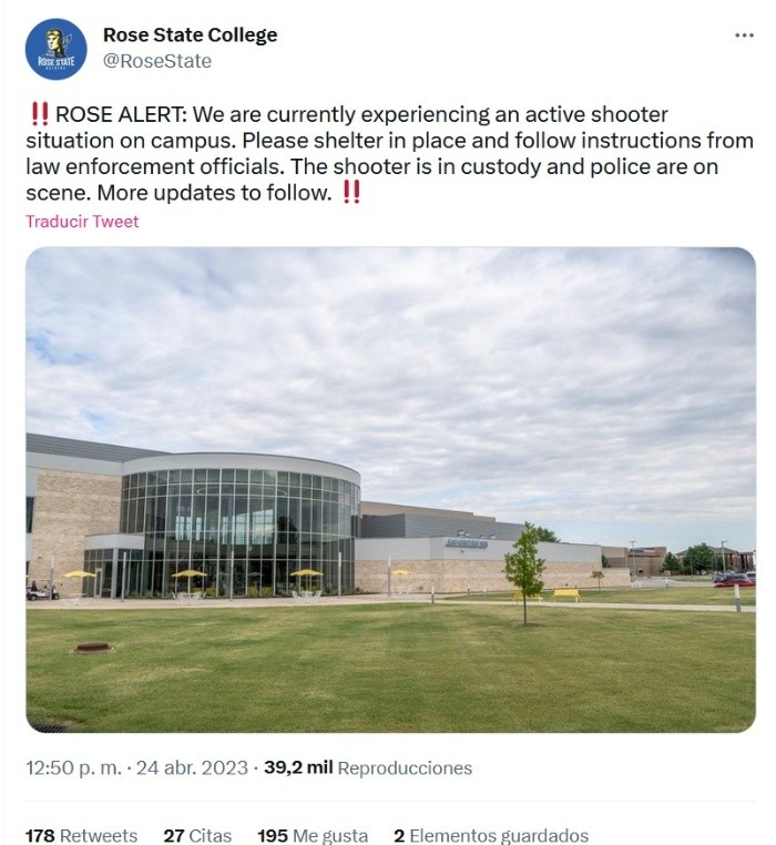 Una persona murió baleada en una universidad en Oklahoma y el presunto agresor ha sido detenido, informó la policía este lunes.El jefe de policía de Midwest City, Sid Porter, dijo que el incidente en el campus de Rose State College parecía estar "relacionado con una disputa doméstica". La escuela en los suburbios de la ciudad de Oklahoma tiene alrededor de 13 mil estudiantes.La escuela había emitido una alerta para pedir a estudiantes y empleados que se refugiaran en el lugar antes que la policía anunciara que habían detenido a un sospechoso.JM