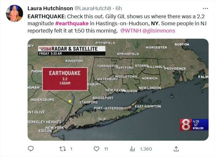 Un microsismo de magnitud de 2.2 se sintió en Nueva York alrededor de la 01:50 de la mañana de este viernes, de acuerdo con el Servicio Geológico de Estados Unidos.Golpeó al sur de Hastings-on-Hudson, un pueblo en el condado de Westchester a unos 80 kilómetros al norte de la ciudad de Nueva York. No hubo informes iniciales de daños o heridos por la actividad sísmica, reportó ABC News.Los residentes de Nueva York y Nueva Jersey describieron el impacto del sismo como dramático y notable, aunque no causó ningún daño."Cuando los terremotos te siguen de Cali a Nueva York (me desperté en mi casa dando tumbos a las 2 a. m.)", escribió un usuario en Twitter.Erica Diggs, residente de Englewood, NJ, una veterana militar que completó dos despliegues en Iraq, comparó la sensación del terremoto con un mortero.La residente de White Plains, NY, Allison Solin, agregó que su falta de familiaridad con los terremotos como neoyorquina provocó cierto pánico."Yo estaba como: 'Eso no es viento'", dijo a ABC News. "Y luego pensé, oh Dios mío, ¿hay una explosión cerca?""Los terremotos no golpean el este de EU con frecuencia, pero las posibles consecuencias de no comprender y planificar tales eventos (...) podrían ser graves", dijo un alto funcionario del USGS en 2021.JM