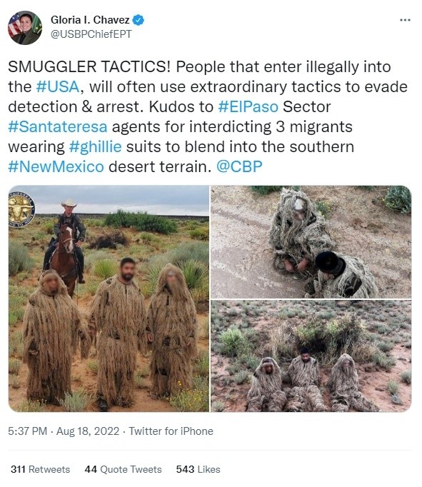 Los agentes de la Patrulla Fronteriza en Nuevo México detuvieron a tres migrantes que se disfrazaron para intentar camuflarse entre las hierbas del desierto.Los detenidos usaban trajes ghillie, comúnmente utilizados por cazadores o militares, pues imitan el aspecto de naturaleza muerta, lo que Gloria Chávez, jefa de la Patrulla Fronteriza en el sector de El Paso, Texas, calificó cómo "tácticas extraordinarias para evitar ser detectados y arrestados".Ella publicó publicó en su página de Twitter @USBPChiefEPT tres fotografías de los hombres junto con el mensaje. Entre octubre del año pasado, cuando comenzó el periodo fiscal 2022, y julio de este año, la Patrulla Fronteriza ha efectuado más de 2.2 millones de detenciones de migrantes en el sur y suroeste del país. MA