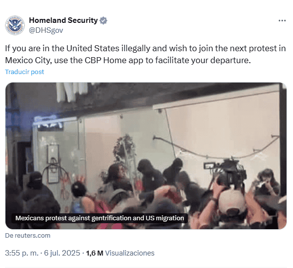El Departamento de Seguridad Nacional (DHS) de Estados Unidos reaccionó a la protesta en contra de la gentrificación registrada el viernes pasado en la Ciudad de México.A través de un post en su cuenta de X, el Departamento, que depende de la secretaria de Seguridad, Kristi Noem, usó las imágenes de la manifestación para invitar a los mexicanos que residen en su país de manera ilegal a autodeportarse mediante el uso de la aplicación CBP Home."Si se encuentra ilegalmente en Estados Unidos y desea unirse a la próxima protesta en Ciudad de México utilice la aplicación CBP Home para facilitar su salida", posteó el DHS en su cuenta de X; publicó además una nota sobre la protesta que terminó en violencia y vandalismo, con negocios, restaurantes y edificios destrozados.El DHS promueve la autodeportación a través de CBP Home, una app que fue modificada por el gobierno de Donald Trump para que en vez de que sea usada para tramitar las solicitudes de asilo de extranjeros, quienes se encuentran en Estados Unidos de manera irregular se inscriban ahí y regresen a sus países, recibiendo apoyo económico de la Unión Americana.En otro mensaje, el DHS usó fotos de las protestas contra la gentrificación, en las que se ven mensajes como "paga impuestos, aprende español, respeta mi cultura", y "no es tu hogar", para resaltar su campaña contra los indocumentados.El gobierno de Trump acusa a los indocumentados de ser "criminales", y lanzó una campaña de deportación masiva este año, con redadas en sitios que van de restaurantes a centros de trabajo e incluso en las sedes donde se efectúan las audiencias migratorias; exige a los migrantes que viven en Estados Unidos pagar impuestos y hablar inglés, entre otros reclamos.El Gobierno de la Ciudad de México rechazó los actos de violencia y mensajes de odio contra los extranjeros que se encontraban en la zona de las protestas en momentos en que en Estados Unidos se vive también un clima de rechazo a los migrantes, en su mayoría mexicanos, que ha sido denunciado por el gobierno de México.En las protestas hubo 13 inmuebles afectados. No se reportaron detenidos.* * * Mantente al día con las noticias, únete a nuestro canal de WhatsApp * * *MB