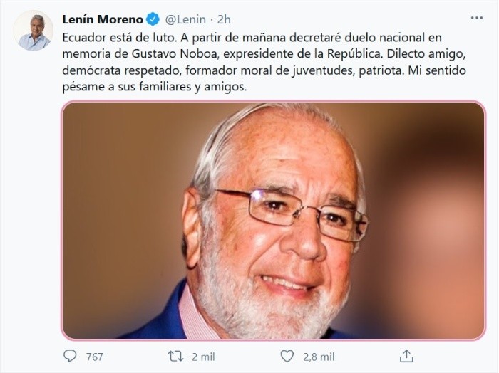 El exmandatario ecuatoriano Gustavo Noboa (2000-2003), de 83 años, falleció el martes en Estados Unidos tras una intervención quirúrgica en la cabeza.El presidente Lenín Moreno escribió en su cuenta de Twitter que "Ecuador está de luto. A partir de mañana decretaré duelo nacional en memoria de Gustavo Noboa, expresidente de la República. Dilecto amigo, demócrata respetado, formador moral de juventudes, patriota. Mi sentido pésame a sus familiares y amigos".A Noboa se le recuerda por su buen carácter y su gentileza, aunque también por su firmeza de convicciones, que se transmitieron a decenas de generaciones desde su calidad de profesor secundario y universitario.Noboa asumió el poder en enero del año 2000, luego de que una revuelta popular pusiera fin al mandato del presidente Jamil Mahuad, en medio de una profunda crisis económica que obligó al país a adoptar el dólar de Estados Unidos como moneda nacional. Entonces, Ecuador estaba al borde de la hiperinflación y la mitad de los 42 bancos de la época habían quebrado o cerrado.En cuanto llegó a la presidencia ratificó el cambio de moneda e hizo frente a las graves consecuencias del fenómeno de "El Niño", especialmente en la costa ecuatoriana, y poco después logró la renegociación de la deuda externa, lo que más tarde derivó en un proceso impulsado por sus rivales políticos, que lo acusaron de malversación de fondos. Ello causó que se asilara en Costa Rica entre 2003 y 2005.Muchos le atribuyen haber logrado dar tranquilidad y estabilidad al país en medio de una época marcada por la convulsión política. Entregó al poder al mandatario Lucio Gutiérrez.Estuvo casado con María Isabel Baquerizo, con quien tuvo seis hijos.El ex vicepresidente Alberto Dahik, en su cuenta de Twitter, aseguró que murió "un presidente honrado, responsable que condujo al país con acierto en momentos muy duros. Un formador de juventudes como ningún otro ... amó mucho a su patria. Siempre dijo: Los tiempos de Dios son perfectos".JM