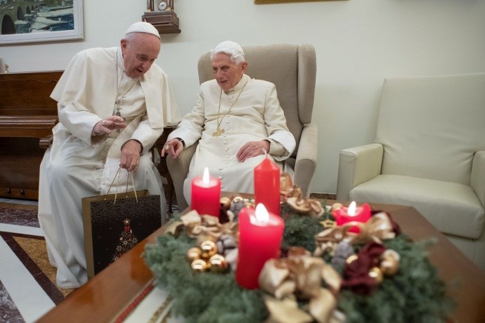 El Papa Francisco cumplió hoy una visita al Papa emérito Benedicto XVI para transmitirle personalmente sus felicitaciones por Navidad e intercambiar regalos.De acuerdo con la Sala de Prensa de la sede católica, el encuentro se inició la tarde de este viernes a las 18:15 horas locales en el Monasterio "Mater Ecclesiae", la casa que el pontífice retirado ocupa dentro del territorio vaticano.La sala de prensa no dio detalles sobre la reunión, aunque sí distribuyó tres fotos en las que se ve a los dos pontífices vestidos de blanco, primero saludándose y luego sentados en la sala de estar del monasterio.En las imágenes se puede apreciar el estable estado de salud del Papa emérito, de 91 años, lo que desmiente los rumores que circularon en los últimos meses sobre un supuesto empeoramiento en su estado o, incluso, que había fallecido.Desde su renuncia al pontificado en febrero de 2013, Ratzinger reside en la casa "Mater Ecclesiae" junto con su histórico secretario privado, el prefecto de la Casa Pontificia Georg Gaenswein, y algunas consagradas que lo atienden en sus necesidades cotidianas.La visita de Jorge Mario Bergoglio a su predecesor es ya una tradición, aunque no siempre el Vaticano suele difundir fotos. La publicación de estas imágenes parece responder a los rumores recientes.JM