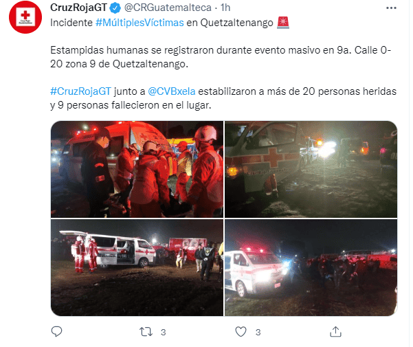 La Cruz Roja Guatemala informó que al menos nueve personas murieron y otras 20 resultaron heridos luego de registrarse una estampida humana al final de un concierto la madrugada de este jueves, por los festejos de la independencia nacional en el oeste del país."La Cruz Roja Guatemalteca junto a los Bomberos Voluntarios estabilizaron a más de 20 personas heridas y nueve fallecieron en el lugar" tras una "estampida humana" en un "evento masivo" en la ciudad de Quetzaltenango, a unos 200 km al oeste de Ciudad de Guatemala, indicó en Twitter la entidad de socorro.Según reportes de la prensa local, las víctimas murieron aplastadas en el momento en que miles de personas intentaban abandonar el área al finalizar un concierto.El percance ocurrió en una explanada al aire libre durante el "Xelafer", un evento tradicional en Quetzaltenango por las fiestas patrias.Guatemala retomó las festividades masivas para celebrar el Día de la Independencia que la convirtió en un país libre e independiente de España el 15 de septiembre de 1821, luego de dos años de la suspensión de estos eventos multitudinarios a causa de la pandemia del COVID.GC