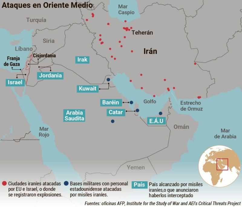 Por su parte, Irán afirmó haber atacado instalaciones militares israelíes y objetivos vinculados a Estados Unidos en países del Golfo. Algunos Gobiernos de la región reportaron interceptaciones de misiles y drones. Las principales aerolíneas suspendieron vuelos hacia Oriente Medio y varios países cerraron su espacio aéreo ante el riesgo de nuevos ataques.