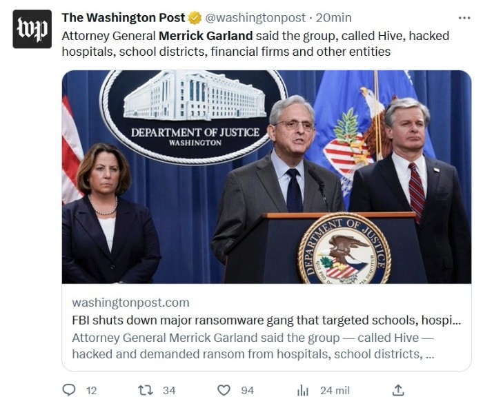 El Departamento de Justicia de Estados Unidos anunció el jueves el desmantelamiento de una de las principales redes de ataque de ransomware del mundo, denominada "Hive", acusada de haber extorsionado a más de mil 500 víctimas en todo el mundo."Anoche, el Departamento de Justicia desmanteló una red internacional de ransomware responsable de extorsionar e intentar extorsionar cientos de millones de dólares a víctimas en Estados Unidos y en el mundo", dijo el fiscal general, Merrick Garland.Los servidores del grupo fueron incautados y la policía federal tomó el control de su sitio en la "darkweb", la parte de Internet a la que no acceden los navegadores convencionales, señaló.La operación se realizó en coordinación con las fuerzas policiales de Alemania y Países Bajos, así como con la Europol, agregó el director del FBI, Christopher Wray.Desde que apareció por primera vez en junio de 2021, más de mil 500 empresas e instituciones fueron pirateadas y el grupo criminal ha sido acusado de recaudar más de 100 millones de dólares en rescates.Tras infiltrarse en un sistema informático, los hackers de ransomware codifican los datos de las empresas y exigen un pago para desbloquearlos.Según firmas especializadas en ciberseguridad, el ransomware Hive ha afectado hospitales estadounidenses, el servicio de salud pública de Costa Rica, la cadena alemana de electrónica Telemarkt y el gigante indio Tata, entre otros.En noviembre, las autoridades estadounidenses emitieron una alerta al respecto para ayudar a las posibles víctimas a hacer frente a estos ataques.La investigación aún está en curso y las autoridades no informaron quién está detrás de Hive ni si hubo algún arresto relacionado.JM