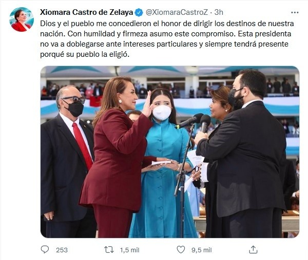 Xiomara Castro juró este jueves como la primera mujer presidenta de Honduras, un país golpeado por la pobreza, la migración, el narcotráfico y la corrupción y al que prometió refundar como un Estado "socialista y democrático"."Este día histórico informaré a la Nación (...) sobre la tragedia social y económica que enfrenta Honduras y sobre mi propuesta de refundación del Estado socialista y democrático", dijo Castro en su primer discurso a la Nación en el Estadio Nacional de Tegucigalpa.Aseguró que los esfuerzos de su gestión hasta el 2026 estarán centrados en "educación, salud, seguridad y empleo".Recibe al país "en bancarrota", aseguró. La deuda pública de Honduras asciende a 17 mil millones de dólares, de los que 11 mil son compromisos internacionales.La dirigente izquierdista juró ante la jueza Carla Romero, flanqueada por Luis Redondo, presidente del Congreso reconocido por la nueva gobernante, tras una crisis parlamentaria. El congresista le impuso la banda presidencial ante unas 29 mil personas.De 62 años y esposa del derrocado expresidente Manuel Zelaya (2006-2009), Castro puso fin a una supremacía de 12 años del Partido Nacional (PN, derecha) con una coalición liderada por su agrupación, Libertad y Refundación (Libre).La investidura tuvo como invitados estelares a la vicepresidenta de Estados Unidos, Kamala Harris, al Rey de España, Felipe VI, y al vicemandatario taiwanés, William Lai.Castro plantea mejorar un país donde la pobreza alcanza al 59% de sus casi 10 millones de habitantes, según cifras oficiales de 2019, aunque la ONG Foro Social de la Deuda Externa y Desarrollo de Honduras (Fosdeh) la ubica en 71% (datos de 2021).Ella habló de un 74%. "Esta cifra por sí misma explica la caravana de miles de personas que de todas las edades huyen para el norte, México y Estados Unidos, buscando un lugar y una forma de subsistir sin importar el riesgo para sus vidas", señaló.También hay una elevada tasa de homicidios de casi 40 por cada 100 mil habitantes, generada por cárteles de drogas y pandillas, a la que suma la pandemia, provocando fuertes corrientes migratorias hacia Estados Unidos en busca de empleo."No más escuadrones de la muerte, no más silencio ante los feminicidios, no más sicariato, no más narcotráfico ni crimen organizado", expresó también Castro.Su antecesor, Juan Orlando Hernández, ha sido señalado por fiscales de Nueva York de mantener nexos con el narcotráfico. Su hermano, el exdiputado "Tony" Hernández, cumple cadena perpetua en Estados Unidos por ese delito. Ambos niegan los cargos.Castro anunció a su gabinete, entre ellos el canciller, Eduardo Enrique Reina, y la ministra de Finanzas, Rixi Moncada. Tendrá como secretario privado a su hijo, Héctor Zelaya, y como ministro de Defensa a José Manuel Zelaya, sobrino. En Honduras no hay ley de nepotismo.Su esposo la ha acompañado en todo momento. Con él, antes de la toma de posesión, hizo un recorrido por la ciudad en un auto descapotado."Volvimos donde nos sacaron hace doce años. Gracias al pueblo, gracias al pueblo. Gracias a Dios y gracias al pueblo", dijo el expresidente Zelaya al ingresar al Palacio Presidencial, para un almuerzo con los invitados.JM