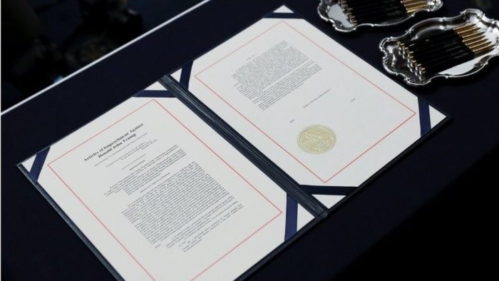 El tercer juicio político a un presidente de Estados Unidos dio este miércoles un nuevo e importante paso adelante.La presidenta de la Cámara de Representantes, Nancy Pelosi, firmó los dos artículos del impeachment al presidente Donald Trump y envió el caso al Senado, donde se realizará el juicio político al mandatario.Pelosi había anunciado horas antes los nombres de los siete congresistas que actuarán como fiscales en el Senado en el caso de abuso de poder y obstrucción al Congreso a raíz del escándalo de Ucrania."Aquí vamos de nuevo, otra estafa de los demócratas que no hacen nada", tuiteó Trump después de que Pelosi revelara los siete nombres.El Senado, donde el Partido Republicano de Trump tiene mayoría, será quien decida si el presidente permanece o no en el cargo.Una destitución del presidente necesitaría de dos tercios de votos de la Cámara Alta.El juicio político, que se espera que dure varias semanas, podría comenzar el próximo martes, según dijo el líder republicano en el Senado, Mitch McConnell.El caso se desencadenó después de la queja de un informante anónimo sobre una llamada telefónica que Trump mantuvo en julio con su homólogo de Ucrania, Volodímir Zelenski.El mandatario estadounidense le pidió que investigara a su rival político Joe Biden, precandidato demócrata a las presidenciales de 2020, y al hijo de este por sus negocios en el país europeo.Según la oposición demócrata, Trump condicionó la entrega de casi US$400 millones en ayuda a Ucrania a que anunciara públicamente esta investigación, algo que el presidente niega.¿Quiénes serán los "mánagers del impeachment"?"Como puede ver en estas descripciones, el énfasis está en los litigantes", dijo Pelosi al explicar cómo eligió a los siete fiscales."El énfasis está en el nivel de comodidad en la sala del tribunal. El énfasis está en hacer el caso más sólido posible para proteger y defender nuestra Constitución para buscar la verdad para el pueblo estadounidense", agregó.Pelosi tuvo la última palabra a la hora de decidir qué congresistas y cuántos actuarán como fiscales en el juicio político, también llamados "mánagers del impeachment".Jerry Nadler, uno de los fiscales designados por Pelosi, acusó a Trump antes de la votación de este miércoles de haber "traicionado al país" por "usar su poder presidencial, incluida la retención de asistencia militar, para presionar a un gobierno para que lo ayudara a ganar las elecciones".Kevin McCarthy, líder de la minoría republicana en la Cámara de Representantes, criticó que "no hay mayor contraste entre lo que estamos haciendo ahora mismo aquí y lo que está ocurriendo en la Avenida de Pensilvania", donde la Casa Blanca acogía en ese momento la firma de la primera fase de un tratado comercial con China a la que acudió Trump.Pelosi pidió a la mayoría republicana en el Senado que permita la celebración de un "juicio justo" contra Trump que incluya nuevas declaraciones de testigos y una revisión de las pruebas documentales, algo que los republicanos rechazan.Aunque se espera que los argumentos iniciales de los cargos contra Trump comiencen el martes, el juicio político comenzará formalmente este jueves cuando el presidente del Tribunal Supremo, John Roberts, acuda a jurar su cargo.La Cámara Alta se convertirá durante semanas en un tribunal en el que los senadores actuarán como miembros de un jurado que escuchará los argumentos de ambas partes antes de decidir sobre la destitución del presidente.Todos los senadores deben participar en las sesiones, incluidos los aspirantes a las primarias demócratas de 2020 como Bernie Sanders o Elizabeth Warren que en poco más de dos semanas tienen los primeros caucus de Iowa.Solo dos presidentes de EE.UU. fueron llevados a juicio político: Bill Clinton en 1998, acusado de perjurio y de obstrucción a la justicia después de mentir sobre su relación con la pasante Mónica Lewinsky; y Andrew Johnson en 1868, solo 11 días después de que destituyera a Edwin Stanton, su "ministro de Guerra", quien no estaba de acuerdo con sus políticas.Ahora puedes recibir notificaciones de BBC News Mundo. Descarga la nueva versión de nuestra app y actívalas para no perderte nuestro mejor contenido.JM