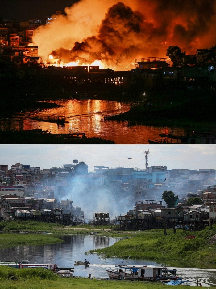 Una vista del barrio Educandos la noche del 17 de diciembre (arriba) y de hoy (abajo), luego del incendio. AFP/M. Dantas
