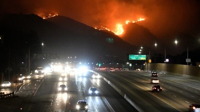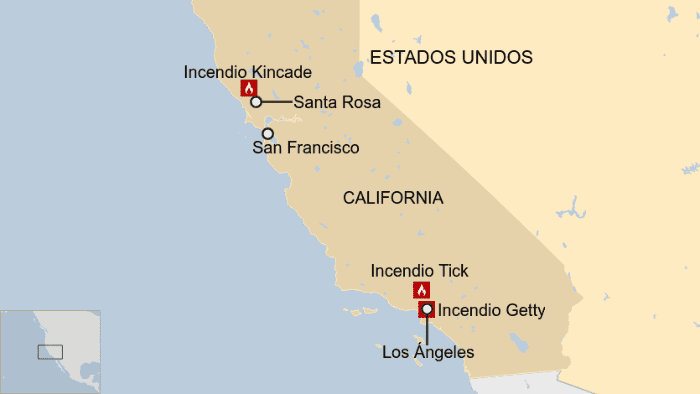 "Mi pareja estaba en la casa y tuvo sólo segundos para salir, coger el perro e irse. Fue así de rápido y todos nuestros vecinos hicieron lo mismo".Así recuerda el corresponsal de la BBC Peter Bowes la tensión vivida en el momento en que su familia tuvo que escapar de su casa en Santa Clarita, al norte de Los Ángeles, ante la cercanía de las llamas.Ese es uno más de los incendios que azotan California desde la semana pasada.Este domingo, las llamas fuera de control llevaron al gobernador Gavin Newsom a declarar el estado de emergencia en toda California.En la madrugada de este lunes un nuevo fuego en una de las zonas más lujosas de Los Ángeles, muy cerca del museo The Getty Center, obligó a 10.000 residentes a abandonar algunas de las casas más caras de la ciudad.Decenas de miles de viviendas se enfrentan a la amenaza de los fuegos, que siguen extendiéndose por la intensidad de los vientos pese al trabajo de los bomberos.En las carreteras, se pudo ver a cientos de vehículos cargados de cajas con las pertenencias de los vecinos de las zonas más afectadas.En total, cerca de 200.000 personas se vieron obligadas a evacuar sus casas y alrededor de un millón se quedaron sin luz.Se trata del apagón controlado más grande en la historia del estado, como estrategia de la compañía eléctrica de evitar nuevos fuegos por el deteriorado estado de buena parte de sus sistema y cableado.Entre los afectados por el incendio más reciente está el jugador de la NBA LeBron James."Estos incendios de Los Ángeles no son ninguna broma", publicó el alero de Akron."Tuve que evacuar mi casa de emergencia y he estado conduciendo con mi familia tratando de encontrar unas habitaciones, de momento sin suerte", tuiteó en la madrugada de este lunes.James encontró finalmente alojamiento, momento que aprovechó para expresar su solidaridad con los afectados y pedir que se pusieran a salvo cuanto antes."Hay viviendas que creemos que se han perdido", dijo el alcalde de Los Ángeles, Eric Garcetti, quien anunció una declaración de emergencia para destinar más recursos a la extinción del llamado "incendio Getty".El fuego amenaza al acomodado barrio de Brentwood, donde uno de sus vecinos le dijo al diario Los Angeles Times que dudaba si evacuar la zona o no y, en caso de hacerlo, cuál de sus autos debería dejar en la casa."Tengo que pensar qué voy a hacer con mi Ferrari", dijo el hombre de 47 años.El incendio Getty provocó que más de 3.000 viviendas en el oeste de Los Ángeles quedaran en zona de evacuación obligatoria.También el incendio Tick cerca de Santa Clarita, al norte de Los Ángeles, provocó la salida de 40.000 vecinos, si bien muchos de ellos regresaron horas después de que el fin de semana los bomberos llegaran a contener"el 70% de las llamas".Sin embargo, la principal orden de evacuación se centra en una amplia área del condado vinícola de Sonoma, en el norte de California, donde el incendio Kincade arrasó desde el miércoles casi 22.000 hectáreas y puso bajo amenaza a unas 80.000 viviendas.Las autoridades temen que las llamas puedan cruzar la autopista 101 y penetre en áreas que no han sufrido incendios forestales desde la década de 1940.Unos 43 de los 58 condados de California estaban este lunes bajo advertencia de "bandera roja" ante la existencia de condiciones proclives a que se originen nuevos fuegos.La compañía eléctrica Pacific Gas & Electric (PG&E) llevó a cabo un apagón controlado ante el riesgo de que los fuegos pudieran extenderse por el mal estado de buena parte de su infraestructura y cableado.Durante el fin de semana, cerca de un millón de personas se quedaron sin luz en el norte de California.PG&E dijo que trabajaría para restablecer el servicio este lunes, pero advirtió sobre nuevos cortes de energía a lo largo del martes si el pronóstico del tiempo mantiene la presencia de fuertes vientos.La empresa, blanco habitual de críticas ante los frecuentes incendios que azotan California, vuelve a estar ahora en el punto de mira.El incendio de Kincade comenzó siete minutos después de que se dañara una línea eléctrica cercana, pero PG&E no confirmó si la falla eléctrica provocó este incendio.La compañía se declaró en bancarrota como protección ante las demandas por el fuego que el año pasado mató a 85 personas.El incendio forestal más mortal en la historia de California fue impulsado por la antigüedad de la infraestructura y equipamiento propiedad de PG&E y se tradujeron en denuncias por responsabilidad contra la empresa que ascendieron a miles de millones de dólares.En un video publicado en Twitter el sábado, el gobernador Newsom dijo que los cortes de energía estaban "enfureciendo a todos, y con razón".El Servicio Nacional de Meteorología (NWS, por sus siglas en inglés) apuntó a una poderosa tormenta de viento que crea "condiciones para incendios potencialmente históricas y extremadamente peligrosas" que continuarán vigentes en la región este lunes y martes."Estamos en la cima del evento de viento en este momento. Todavía tenemos otras 24 horas de condiciones peligrosas de bandera roja", pronosticó un meteorólogo del NWS este domingo.Por su parte, el Departamento de Bomberos del estado alertó que Kincade estaba arrasando un terreno remoto y empinado, lo que dificulta el acceso de los equipos de emergencia.Ahora puedes recibir notificaciones de BBC News Mundo. Descarga nuestra app y actívalas para no perderte nuestro mejor contenido.JM