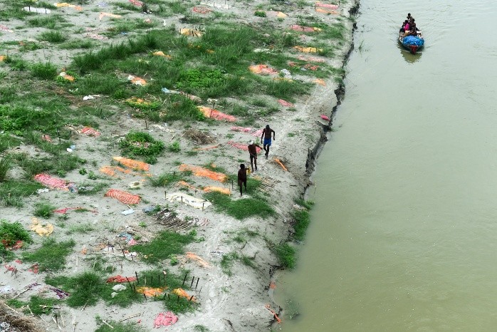 Las lluvias por el monzón en India provocaron impactantes imágenes que revelan la dimensión de las muertes por COVID-19 en India: Cuerpos emergieron de sus tumbas tras la crecida del río Ganges.Los cuerpos envueltos en telas de color azafrán flotan en las aguas del río Ganges, sagrado para los hindúes, o quedaron en la superficie de terrenos en sus orillas.Durante los meses de abril y mayo, los cementerios y crematorios se vieron desbordados por la extraordinaria afluencia diaria de muertos de COVID-19 en la India.Por falta de espacio o de recursos, muchas familias del norte y el este de India se vieron obligadas a entregar los cuerpos de sus seres queridos a las aguas del Ganges.Otros optaron por enterrarlos en tumbas poco profundas en las orillas arenosas del gran río, epíteto de la diosa madre Ganga Ma, que da y toma la vida.Pero la llegada del monzón, acompañada de sus lluvias torrenciales, provocó inundaciones y desalojó a los muertos enterrados en sus orillas.Cerca de 150 cadáveres que aparecieron en las últimas tres semanas fueron incinerados, indicaron autoridades de Allahabad, un importante lugar de peregrinación hindú en el estado de Uttar Pradesh (norte).Ahora las piras funerarias se multiplican en las orillas del río, donde se amontonan pilas de leña en previsión de que aparezcan más cuerpos para incinerar.Decenas de cuerpos parcialmente sumergidos seguían ayer tirados en el río, constató la AFP.En el punto álgido de la segunda ola de la epidemia, hasta 600 cadáveres fueron enterrados sumariamente en las orillas del Ganges, según las autoridades de la ciudad.Pero algunos habitantes creen que esa cifra está subestimada y temen que aparezcan nuevos cuerpos durante las próximas inundaciones.Millones de hindúes acuden tradicionalmente al Ganges para bañarse y lavar sus pecados o para realizar ritos funerarios, que dan lugar a la incineración de los muertos en sus orillas y luego se esparcen sus cenizas en las aguas.Sonu Chandel, un barquero que trabaja en un crematorio a orillas del Ganges, recuerda las escenas de hace unos meses de entierros sumarios que le conmocionaron y está preocupado por la subida de las aguas."Fue muy triste ver a esta pobre gente enterrar a sus seres queridos de una manera tan indigna, y la subida de las aguas no hace más que empeorar la situación", dijo."Siempre tengo miedo de que uno [un cuerpo] golpee mi remo o de que [mi bote] pase por encima de un cadáver al subir el agua", añadió, traumatizado.Esta situación "corre el riesgo de provocar enfermedades peligrosas. El gobierno debe investigarlo", declaró Dipin Kumar, que vive cerca del Ganges, en Allahabad.Los habitantes de otros importantes lugares religiosos del norte de India, situados aguas abajo, temen que la presencia prolongada de cadáveres infecte aún más el río, uno de los más contaminados del mundo.La policía y los equipos de rescate estatales están patrullando en busca de cuerpos en el río.Las autoridades movilizaron dos embarcaciones para esta tarea en las orillas y a veces recurren a los pescadores locales."El flujo es muy rápido", dijo un oficial de policía. "En este momento es un desafío sacar los cuerpos", manifestó.IM