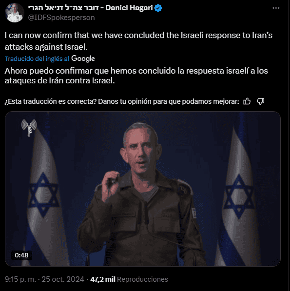 El Ejército israelí anunció el fin de su respuesta contra Irán tras varias horas de "precisos ataques contra objetivos militares" del país en represalia, indicó, "por meses de continuos ataques del régimen en Irán contra el Estado de Israel". "Puedo confirmar que hemos concluido la respuesta de Israel a los ataques de Irán contra Israel", anunció el portavoz de la Fuerzas de Defensa de Israel (IDF, en sus siglas en inglés), Daniel Hagari, en un comunicado poco después de las 6:00 hora local (3:00 GMT). En el mismo señaló que las IDF llevaron a cabo "ataques dirigidos y precisos" contra objetivos militares en Irán, "frustrando amenazas inmediatas al Estado de Israel", menos de cuatro horas después de que un anuncio anterior del Ejército israelí informara del inicio de los ataques. EE