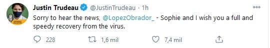 El primer ministro de Canadá, Justin Trudeau, envió un mensaje al Presidente Andrés Manuel López Obrador (AMLO) y lamentó que haya dado positivo a COVID-19.Trudeau publicó un tuit donde señala que él y su esposa Sophie le desean "una rápida y completa recuperación del virus". "Lamento escuchar las noticias @LopezObrador_- Sophie y yo le deseamos una rápida y completa recuperación del virus. Enrique Peña Nieto y Felipe Calderón, entre otros políticos, también unieron y desearon la pronta recuperación de López Obrador."Lamento que el Presidente @lopezobrador_ esté contagiado de COVID-19. Le deseo una pronta y satisfactoria recuperación", escribió Peña Nieto. Este domingo Andrés Manuel López Obrador informó que se contagio de COVID-19, y que aunque tiene síntomas leves ya se encuentra bajo tratamiento médico.El Mandatario señaló que mientras se encuentre en recuperación durante las mañaneras lo representará la secretaria de Gobernación, Olga Sánchez Cordero.JB