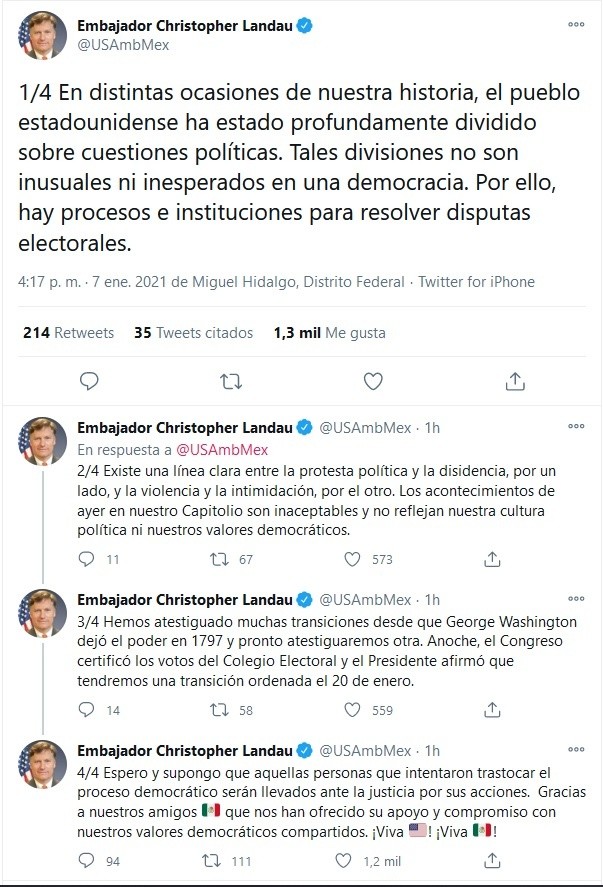 La secretaria de prensa de la Casa Blanca, Kaileigh McEnany, garantizó este jueves que habrá una "transición ordenada" de poder en Estados Unidos, y condenó la violencia del miércoles en el Capitolio.En una conferencia de dos minutos en la que no aceptó preguntas, McEnany se refirió a los incidentes del miércoles, donde simpatizantes del presidente Donald Trump irrumpieron en el Capitolio mientras se contaban los votos del Colegio Electoral que certificaron la victoria de Joe Biden en las presidenciales del 3 de noviembre.Afirmó que tales actos fueron cometidos por "un grupo de gente violenta", que distinguió de los manifestantes que asistieron al mitin de Trump, más temprano.Los autores de los ataques, continuó, "son lo contrario a lo que el gobierno de Trump representa".Finalizó la conferencia diciendo que "aquellos de nosotros que trabajamos en este edificio –la Casa Blanca- estamos trabajando para garantizar una transición ordenada de poder. Es tiempo de que Estados Unidos se una".El embajador de Estados Unidos en México, Christopher Landau, subrayó que los hechos ocurridos este miércoles en el Capitolio, en Washington D.C, son inaceptables y no reflejan la cultura política, cultural, ni los valores estadounidenses.A través de su cuenta de Twitter, el diplomático señaló que en distintas ocasiones de la historia de su país, el pueblo estadounidense ha estado profundamente dividido sobre cuestiones políticas."Tales divisiones", escribió, "no son inusuales ni inesperados en una democracia. Por ello hay procesos e instituciones para resolver disputas electorales".Landau puntualizó que existe una línea clara entre la protesta política y la disidencia, por un lado, y la violencia y la intimidación por el otro."Los acontecimientos de ayer en nuestro Capitolio son inaceptables y no reflejan nuestra cultura política ni nuestros valores democráticos", añadió.JM