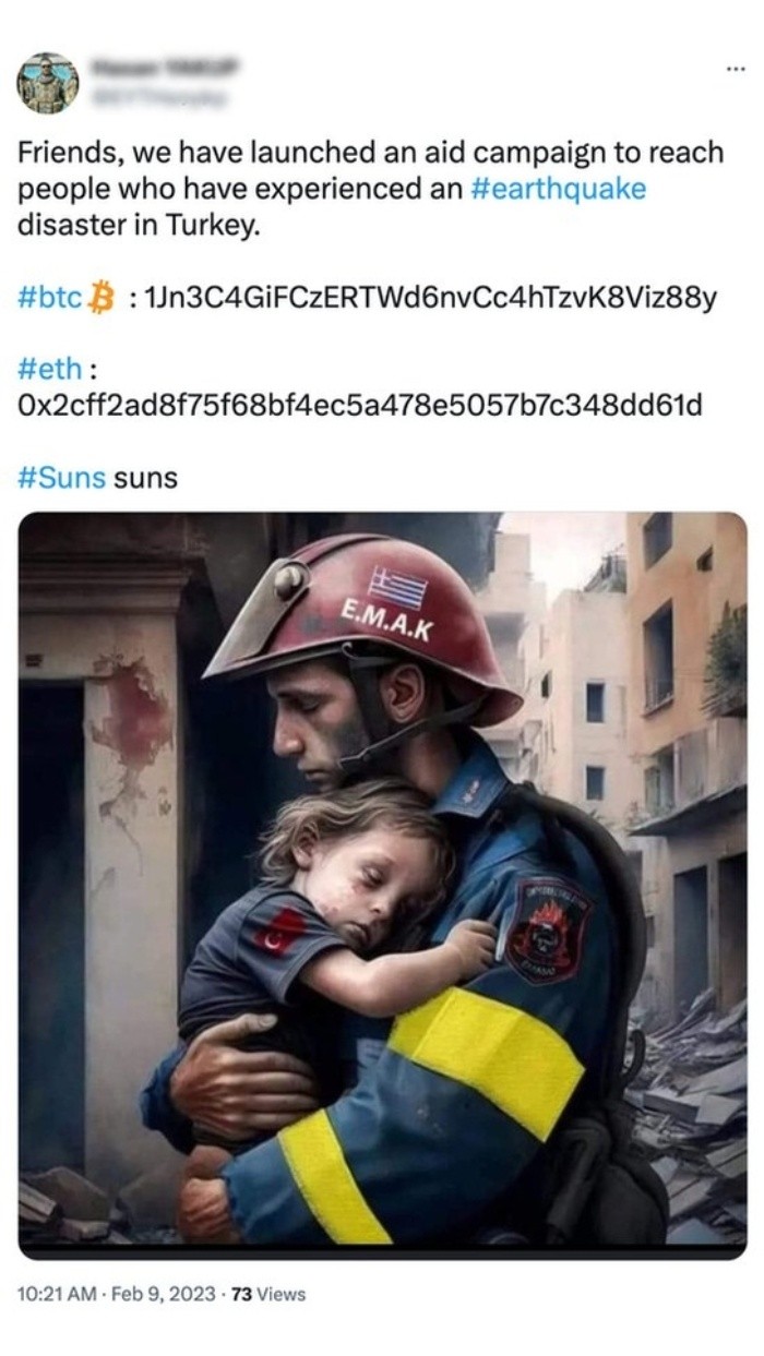 Los estafadores están aprovechando los terremotos de Turquía y Siria para intentar engañar a la gente para que hagan donaciones para causas falsas, según advierten expertos en seguridad.Estas estafas pretenden recaudar dinero para los sobrevivientes, que se han quedado sin calefacción ni agua tras la catástrofe que ha causado la muerte de más de 35.000 personas.Pero en lugar de ayudar a los necesitados, los estafadores están desviando las donaciones de las organizaciones benéficas reales hacia sus propias cuentas de PayPal y carteras de criptomonedas.Hemos identificado algunos de los principales métodos utilizados por los estafadores, así como herramientas que puedes utilizar para realizar una doble comprobación antes de donar.En TikTok Live, los creadores de contenidos pueden ganar dinero recibiendo regalos digitales.Ahora, las cuentas de TikTok están publicando fotos de la devastación, imágenes en bucle y grabaciones de televisiones que muestran las labores de rescate, al tiempo que piden donativos.Los pies de foto incluyen frases como "Ayudemos a Turquía", "Recemos por Turquía" y "Dona para las víctimas del terremoto".Una de las cuentas, que estuvo en directo durante más de tres horas, mostraba una imagen aérea pixelada de edificios destruidos, acompañada de efectos sonoros de explosiones.Fuera de cámara, una voz masculina ríe y habla en chino. La leyenda del video es "Ayudemos a Turquía. Donación".Otro video muestra la imagen de un niño angustiado que huye de una explosión. El mensaje del presentador es "Por favor, ayuda a conseguir este objetivo", una aparente petición de donaciones en TikTok.Pero la foto del niño no es de los terremotos de la semana pasada.Una búsqueda inversa de imágenes encontró que la misma imagen había sido publicada en Twitter en 2018 con la leyenda "Detengan el genocidio de Afrin", en referencia a una ciudad en el noroeste de Siria donde las fuerzas turcas y sus aliados en la oposición siria expulsaron a una milicia kurda ese año.Otra advertencia sobre las donaciones en TikTok: una investigación de la BBC descubrió que TikTok se lleva hasta 70% de los ingresos de las donaciones digitales, aunque la plataforma asegura que se lleva menos que eso.Un portavoz de TikTok aseguró a la BBC: "Estamos profundamente entristecidos por los devastadores terremotos en Turquía y Siria y estamos contribuyendo a ayudar a los esfuerzos de socorro por el terremoto". "También estamos trabajando activamente para evitar que la gente estafe y engañe a los miembros de la comunidad que quieren ayudar".En Twitter, la gente está compartiendo imágenes emotivas junto a enlaces a carteras de criptomonedas pidiendo donaciones.Una cuenta publicó el mismo llamado ocho veces en 12 horas, con una imagen de un bombero sosteniendo a un niño pequeño entre edificios derrumbados.La imagen utilizada, sin embargo, no es real. El periódico griego OEMA informa que fue creada por el Mayor General del cuerpo de bomberos del Egeo, Panagiotis Kotridis, con el uso del software de Inteligencia Artificial Midjourney.Los generadores de imágenes por IA suelen cometer errores y los usuarios de Twitter no tardaron en darse cuenta de que este bombero tiene seis dedos en la mano derecha.Para comprobarlo, pedimos a nuestros colegas del centro de investigación tecnológica de la BBC, Blue Room, que intentaran generar imágenes similares con el mismo software.Pidieron al software una "imagen de un bombero tras un terremoto rescatando a un niño y con un casco con la bandera griega", y recibieron las siguientes opciones:Una de las direcciones de la criptocartera se había utilizado en tuits de estafa y spam de 2018. La otra dirección se había publicado en la red social rusa VK, junto con contenido pornográfico.Cuando la BBC se puso en contacto con la persona que tuiteó el llamado, negaron que fuera una estafa. Dijeron que tenían mala conexión para hablar, pero respondieron a nuestras preguntas en Twitter usando Google Translate."Mi objetivo es poder ayudar a las personas afectadas por el terremoto si consigo recaudar fondos", dijeron. "Ahora la gente pasa frío en la zona del desastre, y especialmente los bebés no tienen comida. Puedo demostrar este proceso con recibos".Sin embargo, aún no nos han enviado recibos ni pruebas de su identidad.En otros lugares de Twitter, los estafadores crean cuentas falsas para recaudar fondos y publican enlaces a PayPal.Ax Sharma, experto en ciberseguridad de Sonatype, afirma que estas cuentas retuitean artículos de noticias y responden a tuits de famosos y empresas para ganar visibilidad."Crean cuentas falsas de ayuda en caso de catástrofe que parecen ser de organizaciones o medios de comunicación legítimos, pero luego envían fondos a sus propias direcciones de PayPal", explica a la BBC.Un ejemplo es @TurkeyRelief, que se unió a Twitter en enero, tiene solo 31 seguidores y solicita donaciones a través de PayPal.La cuenta de PayPal ha recibido hasta ahora US$900 en donaciones. Pero eso incluye 500 dólares del creador de la página, que donó para su propia causa.Sharma dice que esto es "para que la recaudación de fondos parezca auténtica".Esta es una de las más de 100 campañas de recaudaciones de fondos lanzadas en PayPal en los últimos días en apoyo a los afectados por los terremotos, algunas de las cuales son falsas.Sharma asegura que los donantes deben desconfiar especialmente de las cuentas que dicen estar en Turquía, porque PayPal no opera en Turquía desde 2016."Hay organizaciones benéficas reales fuera de Turquía que usan PayPal, pero cuando estos recaudadores de fondos dicen que están en Turquía, eso es una bandera roja", asevera.Otra cosa con la que hay que estar alerta son las donaciones anónimas y los llamados que han recaudado pequeñas cantidades.Según Sharma, es de esperar que las organizaciones benéficas reales dispongan de "fondos considerables", pero muchas de las que recaudan fondos a través