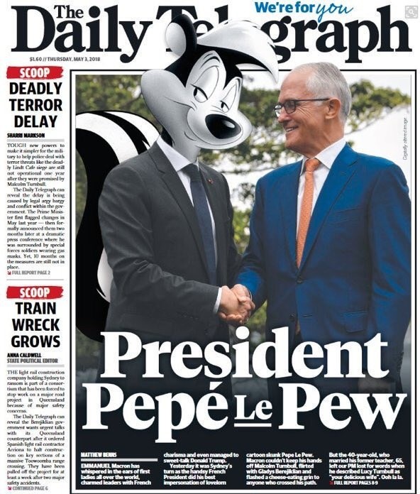 El presidente francés, Emmanuel Macron, se tomó a risa el jueves la sorna general que provocó la víspera al calificar de "deliciosa" a la esposa del primer ministro australiano, Malcolm Turnbull.La metedura de pata -"delicious" en inglés quiere decir "sabroso" o "excitante"- provocó numerosas bromas: un tabloide de Sídney publicó una foto a página completa de Macron con la cara de Pepe Le Pew, también conocido como "Zorrillo", la enamoradiza mofeta francesa de Loonely Tunes."Un diario se divirtió y me hizo reír mucho, sobre todo porque en el dibujo animado original el personaje tiene acento francés", dijo Macron a los periodistas poco antes de partir de Sídney al término de una visita de dos días.El desliz ocurrió al final de una rueda de prensa conjunta el miércoles, cuando Macron se giró hacia Turnbull y le dijo: "Gracias a usted y a su deliciosa esposa por este cálido recibimiento".En una cena privada más tarde ese día con Turnbull y su esposa Lucy, el alboroto mediático provocado por sus comentarios "les hizo reír mucho", afirmó.Turnbull también comentó la burla, asegurando que su esposa "está muy alagada" por los comentarios del joven presidente de Francia."Me pidió que diga que encontró el halago del presidente tan encantador como memorable", afirmó.JB