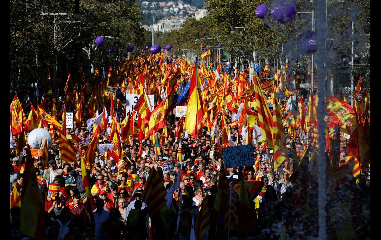 Miles de personas se manifiestan en el centro de Barcelona en contra de la declaración de independencia realizada el viernes pasado por el Parlamento de esa región y en favor de la unidad de España."Todos somos Cataluña" es el lema de esa marcha organizada por una entidad denominada Sociedad Civil Catalana (SCC) y en la que participan dirigentes de Ciudadanos (liberales), PSC (socialistas) y PPC (centroderecha).Esos tres grupos abandonaron el hemiciclo catalán el viernes antes de la votación de la resolución sobre la independencia de Cataluña.Horas después el Consejo de Ministros del Gobierno español, previa autorización del Senado, decretó el cese de todo el Gabinete regional y la disolución del Parlamento autonómico, con la convocatoria de elecciones para el próximo 21 de diciembre.En la cabecera de la manifestación figuran dirigentes políticos, incluida la ministra de española de Sanidad, la catalana Dolors Montserrat.A lo largo del recorrido se ven numerosas banderas españolas, pero también catalanas y europeas, y hay cánticos de "viva España" y "viva Cataluña".Está previsto que al final de la manifestación tomen la palabra el exministro del PP Josep Piqué, el exministro socialista y expresidente del Parlamento Europea Josep Borrell y exlíder del Partido Comunista Español, Paco Frutos.
