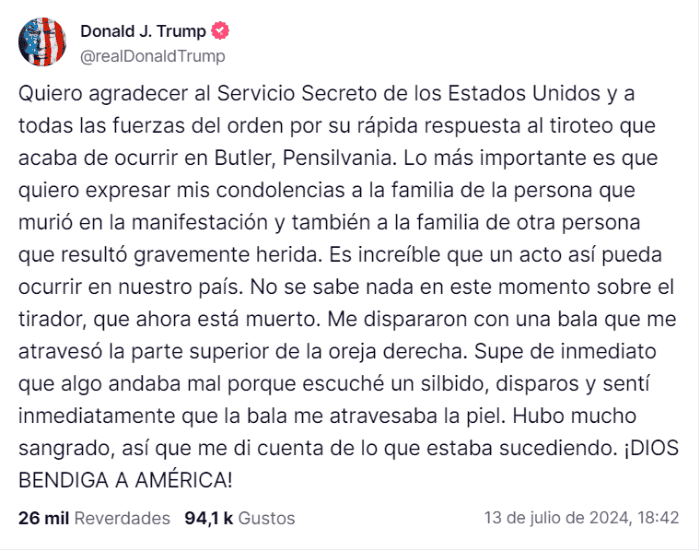 Luego de haber sido atacado durante un mitin en Butler, Pensilvania y que se le viera herido, el expresidente de Estados Unidos, Donald Trump, mediante su red social llamada Truth Social, se comunicó con todos sus simpatizantes para hacerles saber que se encuentra bien.Comenzó agradeciendo al Servicio Secreto de los Estados Unidos, equipo de seguridad que lo acompañaba y lo resguardó durante el atentado para después evacuarlo sin ninguna otra herida. Posteriormente, expresó sus condolencias a las familias de un civil fallecido y de otro gravemente herido.Sobre la sangre que se observó en su rostro tras los disparos, Trump expresó lo siguiente:"Me dispararon con una bala que me atravesó la parte superior de la oreja derecha. Supe de inmediato que algo andaba mal porque escuché un silbido, disparos y sentí inmediatamente que la bala me atravesaba la piel".Aseguro que de momento no se sabe nada sobre la identidad del tirador más que fue abatido y por consecuencia perdió la vida. Se dijo incrédulo de que hechos como este ocurrieran en su país y concluyó diciendo "¡DIOS BENDIGA A AMÉRICA!".El fiscal de distrito del condado Butler, Richard Goldinger, mencionó en una entrevista telefónica con el medio AP que el supuesto atacante fue neutralizado y que al menos una persona que asistía al mitin perdió la vida.El suceso ocurrido este sábado durante un mitin de campaña del expresidente Donald Trump en Pensilvania está siendo investigado como un intento de asesinato del probable candidato republicano, informaron autoridades policiales.YC