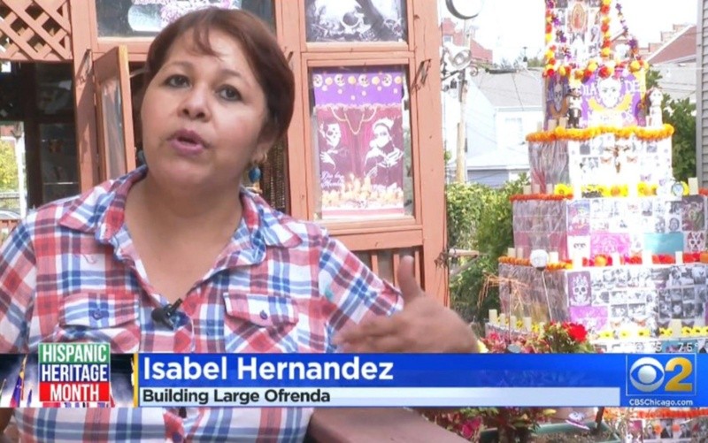 Una de las grandes atracciones de las celebraciones de Día de Muertos en Chicago este año está instalada en el jardín de una migrante mexicana. Con 6 metros de altura, la ofrenda más grande que hasta ahora ha visto la Ciudad llama la atención, a diario, de cientos de personas que se acercan hasta la casa de Isabel Hernández, ubicada en el vecindario de Pilsen, para sacar fotos y subirlas a Facebook o Instagram.La ofrenda ha llamado la atención fuera de los límites de la ciudad. Las cadenas televisivas americanas ABC, CBS y NBC han transmitido, desde Chicago, reportajes especiales sobre la ofrenda de Isabel. Univisión y Telemundo han hecho lo mismo en español. Su cuenta de Instagram tenía hace un mes cerca de 2 mil seguidores. Hoy tiene 350 mil seguidores.Increíblemente, ya desde hace algunos años, el Día de Muertos es la celebración mexicana que más atención llama entre grupos raciales no hispanos representados en Chicago. Hay una renovada fascinación en comunidades afroamericanas, asiáticas y anglosajonas por saber más sobre esta festividad que rinde homenaje a las personas fallecidas a través de un altar lleno de fotos, que invita anualmente al regreso de los espíritus.Hernández, conocida en el vecindario de Pilsen por las decoraciones que hace en su gran y colorido jardín, así como por sus decoraciones navideñas, ya había instalado un altar el año pasado. Este año triplicó su tamaño: mide 6 metros de alto y una forma piramidal más tradicional.Contar la tradiciónSegún ha explicado la originaria de Ciudad Juárez, Chihuahua, ella intentó este año hacer una pirámide que representantase los siete niveles de la vida, en que cada nivel representa la forma en que cada persona atraviesa su vida, desde el nacimiento hasta la muerte.La ofrenda se hizo con más de 170 cajas de plástico que Hernández recibió de un banco de alimentos local, atadas con cuerdas. El séptimo nivel está hecho con partes de piezas de madera perforadas que venían en el interior de las cajas.Hernández reunió, con sus vecinos, casi 300 fotos de parientes o amigos fallecidos. La mayoría de las personas que aparecen murieron en los últimos 18 meses, a causa de COVID-19.Isabel está feliz en ver todos los días como la gente viene de otros lugares de Illinois solo a tomar fotos de su trabajo. Hay familias latinas que han viajado desde St Louis, Missouri, a 5 horas de carretera de Chicago, para subir a su Instagram una foto junto a la ofrenda.Dos veces a la semana, en asociación con la Dirección de Cultura y Eventos de la Ciudad de Chicago, Isabel recibe visita de maestros y alumnos de escuelas públicas que quieren saber más sobre la ofrenda.Los 7 nivelesVelas, flores de papel, velas y dulces tradicionales mexicanos están meticulosamente distribuidos en los siete niveles de la ofrenda. Debajo de todas las fotos están nombres y su fecha de deceso.El nivel más alto presenta a la familia de Hernández; el segundo nivel, amigos cercanos y vecinos; el tercer nivel, miembros prominentes de la comunidad; el cuarto nivel está reservado para perros y gatos, porque ella dice que “las mascotas también son parte de nuestras familias”. El quinto y sexto nivel muestran fotos que la gente le envió desde otras comunidades de Chicago.Hernández ha vivido en Pilsen desde hace 43 años. Cuando se mudó allí no muchas personas en este vecindario históricamente mexicano celebraban Día de Muertos. Pero la fiesta ha ganado mucha popularidad en los últimos 5 años. Aunque le encanta la reacción de la gente y los agradecimientos que recibe del vecindario, Isabel confirmó que 2021 será este el último año en que colocará una ofrenda en su jardín, citando la cantidad de trabajo que requiere y la dificultad para almacenar todas las decoraciones. Isabel todavía planea mostrar sus habilidades para la que sigue considerando su fiesta favorita: la Navidad.Para saberDebido al gran interés de escuelas y comunidades no hispanas de Chicago por ver altares y conocer más detalles sobre la celebración de Día de Muertos, el Museo Nacional de Arte Mexicano debió habilitar este año, por primera vez en su historia, días y horas para seguir funcionando fuera de horario habitual.El único gran Museo exclusivamente dedicado a la cultura mexicana de todo el país, normalmente abre de las 10 a las 17 horas, cerrando los jueves. En las próximas tres semanas abrirá todos los días de las 9 a las 20 horas.El museo está ubicado en el 1852 W. de la calle 19, en el emblemático barrio de Pilsen, con amplia mayoría de mexicanos.Los visitantes también pueden participar en actividades artísticas del Día de los Muertos y visitar la tienda de regalos. La entrada es gratuita para todos.Impulsan Memorial para víctimas del COVID-19Una tapatía que reside en el vecindario de Albany Park está trabajando con el Distrito de Parques de Chicago y con la oficina de la alcaldesa Lori Lighftoot para hacer un monumento público en honor a los más de 17 mil 600 habitantes de la ciudad que han fallecido a causa del coronavirus.El proyecto del Memorial estaba congelado desde hacía meses. Pero el reciente nombramiento de la zacatecana Rosa Escareño como nueva Superintendente del Distrito de Parques ha reactivado la idea. Escareño ve con buenos ojos la idea de Luz María Sánchez Vargas, quien quiere llevar su proyecto “Corazón de Flores” al centro de Chicago. Su madre, Paula Vargas, de 67 años, originaria de Guadalajara, murió a causa de COVID-19 hace un año.Luz María encabeza un movimiento de casi 10 mil familiares y amigos de personas fallecidas durante la pandemia. La mayoría de los muertos a causa de COVID-19 son latinos y afroamericanos.“Necesitamos ser parte de las decisiones que se toman en la Ciudad y de los esfuerzos de resiliencia para terminar de recuperarnos. Nosotros también somos víctimas. Nuestro duelo durará mucho tiempo”, explicó la tapatía en entrevista al canal local abc7.
