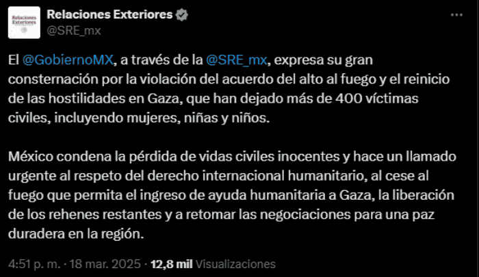 El Gobierno de México manifestó este martes su profunda preocupación ante la violación del acuerdo de alto al fuego y el reinicio de los enfrentamientos en Gaza, luego del ataque de Israel contra la población civil que, en la madrugada, dejó un saldo de más de 400 personas fallecidas, entre ellas un significativo número de mujeres y niños.Mediante un comunicado, la Cancillería mexicana hizo un llamado urgente al respeto del derecho internacional humanitario y exhortó a reanudar las negociaciones en busca de una paz duradera en la región."El Gobierno de México, a través de la Secretaría de Relaciones Exteriores (SRE, Cancillería) de México, expresa su gran consternación por la violación del acuerdo del alto al fuego y el reinicio de las hostilidades en Gaza, que han dejado más de 400 víctimas civiles, incluyendo mujeres, niñas y niños", subrayó.Asimismo, instó a un nuevo "cese al fuego que permita el ingreso de ayuda humanitaria a Gaza y la liberación de los rehenes restantes".El Gobierno israelí reanudó este martes los ataques militares sobre la Franja de Gaza y rompió el alto el fuego que mantenía con el grupo islamista Hamás desde hace dos meses, con bombardeos masivos que han causado cientos de muertos en puntos del territorio palestino.En enero de 2024, México, junto con Chile, presentó ante el fiscal de la Corte Penal Internacional (CPI) una solicitud para que se investiguen probables crímenes de guerra en el marco del conflicto entre Israel y Hamás, que ya suma más de 45 mil civiles muertos. YC
