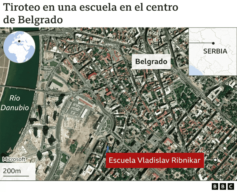 Al menos ocho estudiantes y un guardia de seguridad han muerto tras un tiroteo en una escuela de Belgrado, la capital de Serbia.Otros seis alumnos y un profesor resultaron heridos en el ataque y han sido trasladados al hospital, informó el Ministerio del Interior en un comunicado.La policía detuvo a un estudiante de 14 años de la escuela Vladislav Ribnikar, en el centro de Belgrado, en relación con el ataque ocurrido este miércoles por la mañana.El sospechoso habría utilizado el arma de su padre, según las autoridades que aún están investigando los motivos del incidente.Agentes con cascos y chalecos antibalas acordonaron los alrededores de la escuela, situada en el céntrico barrio de Vracar, poco después de las 08:40 hora local (06:40 GMT)."La policía envió inmediatamente al lugar a todas las patrullas de policía disponibles y detuvo a un presunto menor, un alumno de séptimo curso sospechoso de haber efectuado varios disparos con el arma de su padre en dirección a los estudiantes y a la seguridad de la escuela", informó el Ministerio del Interior en un comunicado."Todas las fuerzas policiales siguen sobre el terreno trabajando intensamente para esclarecer todos los hechos y circunstancias que condujeron a esta tragedia", añadió en un mensaje posterior.El portavoz de la policía informó que que el atacante planeó el tiroteo con un mes de antelación.El sospechoso tenía una lista de niños a los que iba a disparar y planeó detalladamente a qué aulas entraría primero, según el portavoz.Asimismo, indicó que el atacante pudo haber elegido un aula en particular porque estaba cerca de la entrada. El motivo del atacante aún se desconoce, añadió.Recuerda que puedes recibir notificaciones de BBC Mundo. Descarga la nueva versión de nuestra app y actívalas para no perderte nuestro mejor contenido.JM