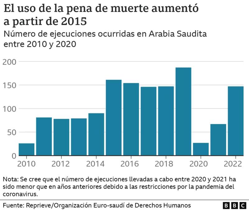 Arabia Saudita ha aplicado la pena de muerte a presos sin avisar con antelación a sus familias, declararon a la BBC parientes de algunos de los condenados a la pena capital.Y es que la tasa de ejecuciones en el país casi se ha duplicado desde 2015, según reveló un nuevo informe. Ese año el rey Salman y su hijo Mohammed bin Salman asumieron el poder.A la familia de Mustafá al-Khayyat no la avisaron de que éste estaba a punto de ser ajusticiado.Aún no tienen un cuerpo que enterrar, ni tumba que visitar. Lo último que supieron de él fue por una llamada telefónica que les hizo desde la cárcel. El hombre se despidió con estas palabras a su madre: "Muy bien, me tengo que ir. Me alegro de que estés bien".Ninguno de los dos sospechaba que sería la última vez que hablarían.Un mes después, Mustafá había muerto. Fue uno de los 81 hombres ajusticiados el 12 de marzo de 2022 en la mayor ejecución masiva de la historia moderna de Arabia Saudita.El nombre de Mustafá figura en una larga y creciente lista elaborada por la agrupación Reprieve, la cual, junto con la Organización Euro-saudí de Derechos Humanos, ha documentado meticulosamente las ejecuciones realizadas por los saudíes para un informe.Con datos recogidos desde 2010 el estudio ha revelado que:Reprieve documentó 147 ejecuciones en Arabia Saudita el año pasado, pero afirmó que han podido ser más.También señaló que el país ha aplicado "desproporcionadamente" la pena de muerte contra ciudadanos extranjeros, entre ellos trabajadoras domésticas y pequeños traficantes de drogas.Casi un año después, las autoridades no le han comunicado a la familia de Mustafá cómo fueron ejecutados él y los demás. Su hermano mayor, Yasser, afirmó que ha sido una tragedia para las familias."No sabemos si les dieron un entierro decente o si los arrojaron al desierto o al mar. No tenemos ni idea", afirmó el hombre.Yasser habla públicamente sobre el asunto por primera vez. Ahora vive en Alemania, donde se le ha concedido asilo político tras huir de Arabia Saudita en 2016, temiendo correr la misma suerte que su hermano.El hermano del ejecutado aseguró que éste era "divertido, sociable y popular". Desde 2011, Mustafá participaba a diario en manifestaciones de la minoría chiita del país contra el gobierno saudita hasta que fue detenido en 2014.Tras su muerte, las autoridades emitieron un comunicado en el que informaron de que el hombre, junto con otras 30 personas, había sido ejecutado por cometer delitos como intento de asesinato contra agentes de seguridad, violación, robo, fabricación de bombas, agitación y propagación del caos, así como tráfico de armas y drogas."Nunca aportaron pruebas. Esa mentira cala muy hondo", explicó Yasser, quien afirmó que su hermano aún estaba intentando recurrir su condena cuando las autoridades lo ejecutaron a él y a los otros 80 hombres."No sólo les quitaron la vida, sino que los difamaron intencionadamente y los acusaron de cosas que no habían hecho", agregó.Tras subir al poder, el príncipe heredero Mohammed bin Salman, gobernante de facto de Arabia Saudita, prometió modernizar el reino y en una entrevista en 2018 dijo que su país, un aliado occidental clave, estaba tratando de "minimizar" el uso de la pena de muerte.Sin embargo, casi cinco años después, Arabia Saudita sigue siendo uno de los ejecutores más prolíficos del mundo. Esto, a pesar de una pausa que coincidió con la presidencia del país del G20 y el inicio de la pandemia de covid-19.El príncipe heredero -conocido como MBS- ha "hecho exactamente lo contrario de lo que prometió", declaró la directora de Reprieve, Maya Foa, desde su oficina del este de Londres (Reino Unido)."Ha supervisado un gran número de ejecuciones y una brutal represión contra los asistentes a las protestas prodemocráticas", agregó.Además, añadió que existe un régimen de secretismo en torno a la pena de muerte y explicó que en muchos de los casos que Reprieve ha estudiado, los reos ignoraban que estaban en el corredor de la muerte."Sus familiares no lo sabían. Así que había personas que eran detenidas, juzgadas, condenadas a muerte y luego ejecutadas en secreto", dijo.Algunas familias sólo descubrieron a través de las redes sociales que sus seres queridos habían sido ajusticiados, afirmó Foa, quien describió esa falta de información oficial como uno de los aspectos "más crueles y angustiosos" de cada caso.La decapitación ha sido tradicionalmente el principal método de ejecución en Arabia Saudita. Las ejecuciones solían tener lugar en público y los nombres de los asesinados y los cargos que se les imputaban se publicaban en sitios web del gobierno.Sin embargo, activistas de derechos humanos afirman que el uso de la pena capital se ha vuelto mucho más opaco.Ninguno de los consultados sabía exactamente cómo se llevan a cabo ahora las ejecuciones, aunque dijeron que también se utilizan pelotones de fusilamiento.La pena de muerte forma parte de un sistema jurídico del país que "es injusto en su esencia", afirmó Ali Adubisi, director de la Organización Euro-saudí de Derechos Humanos, con sede en Berlín."Ninguna organización civil independiente o grupo de derechos humanos puede operar allí. Si no llamáramos la atención sobre las ejecuciones, la gente moriría en silencio", denunció.Human Rights Watch afirmó que 41 de los 81 hombres ejecutados en marzo pasado pertenecían a la minoría chiita y que "los abusos rampantes y sistémicos en el sistema de justicia penal de Arabia Saudita sugieren que es muy poco probable que alguno de los hombres recibiera un juicio justo".La agrupación también aseguró que recibió informes sobre torturas.Cuando Yasser pudo visitar a Mustafá por primera vez, 12 meses después de su detención en 2014, quedó conmocionado con lo que vio."Aunque había pasado un año desde la última vez que lo vimos, ni siquiera podía levantarse para saludarnos", relató."Se caía en cuant