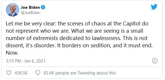 El presidente electo de EU, Joe Biden, dijo este miércoles que la democracia del país "está bajo un asalto sin precedentes", una "insurrección" que "roza la sedición, y debe acabar ahora", después de la irrupción en el Congreso de cientos de seguidores del mandatario Donald Trump."Nuestra democracia está bajo un asalto sin precedentes, esto es algo que no se parece a nada que hayamos visto en los tiempos modernos. Un asalto al alcázar de la libertad, el propio Capitolio", dijo Biden en una declaración a la prensa desde Wilmington, Delaware.Biden, que llegará al poder el 20 de enero, habló unas dos horas después de que los seguidores de Trump entraran a la fuerza en el Capitolio y causaran destrozos, además de protagonizar enfrentamientos con las fuerzas de seguridad."Seré muy claro: las escenas de caos en el Capitolio no reflejan a los Estados Unidos reales, no representan lo que somos. Lo que estamos viendo es un pequeño número de extremistas dedicados a la ilegalidad", subrayó el presidente electo."Esto no es disenso, esto es desorden, es caos, roza la sedición, y debe acabar, ahora. Pido a esta turba que se retire y permita que siga adelante el trabajo de la democracia", añadió.Biden subrayó que "las palabras de un presidente importan", e instó a Trump a pedir a sus simpatizantes que pararan la "insurrección" en el Congreso."Pido al presidente Trump que salga ahora en la televisión nacional para cumplir con su juramento de defender la Constitución, y exija un fin a este asedio", agregó.Poco después, Trump publicó un video en su cuenta oficial de Twitter en el que hizo algo parecido, aunque insistió en sus denuncias sin pruebas de fraude electoral, que son las que alimentaron el alzamiento de sus seguidores.JM