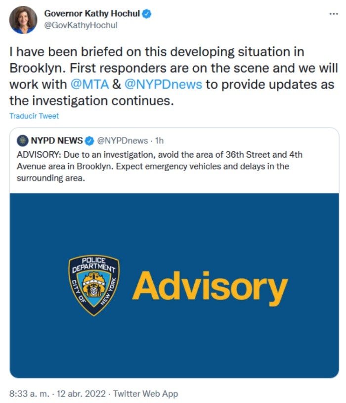 Al menos cinco personas resultaron heridas de bala en un tiroteo registrado este martes 12 de abril en el metro de Nueva York, en el que aparentemente también se detonó una bomba de gas, según información de medios locales.La policía busca a un hombre con una máscara de gas y un chaleco de construcción naranja como posible sospechoso del ataque, señalan las mismas fuentes.Imágenes distribuidas en las redes sociales muestran a varias personas heridas y cubiertas en sangre siendo atendidas en un andén de la estación de la calle 36 en Brooklyn, en el barrio de Sunset Park, una zona con una gran población mexicana.También se han publicado algunas fotografías de un vagón de metro lleno de humo y, por ahora, no está claro si el tiroteo tuvo lugar en la estación o dentro de un tren.Según la cadena CNN, en total habría al menos 13 heridos, un mínimo de cinco de ellos con impactos de bala.Las autoridades han pedido a los ciudadanos evitar la zona, donde se han desplegado numerosas ambulancias y unidades de policía.La gobernadora del estado, Kathy Hochul, dijo a través de Twitter que recibió un informe de la situación en Brooklyn y que los equipos de emergencia están en el área.OF