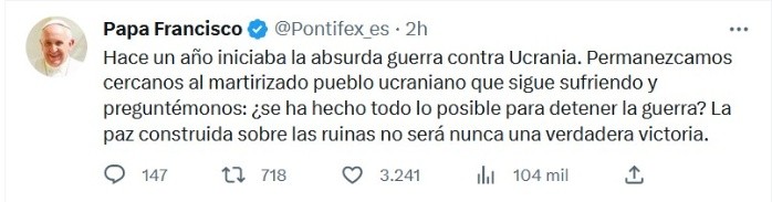 El Papa Francisco recordó este viernes el aniversario del inicio de la guerra en Ucrania tras la invasión de Rusia y se preguntó: "¿Se ha hecho todo lo posible para detener la guerra?", en un mensaje en su cuenta en Twitter."Hace un año iniciaba la absurda guerra contra Ucrania. Permanezcamos cercanos al martirizado pueblo ucraniano que sigue sufriendo y preguntémonos: ¿Se ha hecho todo lo posible para detener la guerra? La paz construida sobre las ruinas no será nunca una verdadera victoria", escribió el Papa en los varios idiomas de sus cuentas en Twitter que suman 54 millones de seguidores.Este miércoles durante la audiencia general, el Papa había pedido un alto el fuego en Ucrania y que se inicien negociaciones de paz."Hago un llamamiento a todos los que tienen autoridad sobre las naciones para que se impliquen en el final del conflicto, se comprometan en un alto el fuego y se inicien negociaciones de paz", dijo el Pontífice al término de la audiencia general celebrada en el Vaticano."El balance de muertos y heridos, de desplazados, de destrucción, de daños económicos y sociales habla por sí mismo. ¿Podrá el señor perdonar tantos crímenes y tanta violencia?", inquirió, antes de mostrar su cercanía al martirizado pueblo ucraniano, que sigue sufriendo".El Vaticano ha intentado en varias ocasiones una mediación que ha sido rechazada por Rusia y en la rueda de prensa de regreso de su viaje a África, el papa reiteró su ofrecimiento a reunirse tanto con el presidente ucraniano, Volodímir Zelenski, como con el ruso, Vladímir Putin, y explicó que no irá a Kiev porque por el momento no puede ir a Moscú.JM