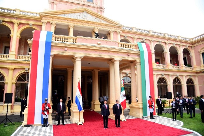 El gobierno de Paraguay aclaró que la ausencia de los escudos nacionales de México y de ese país sudamericano en las banderas colocadas en la ceremonia oficial de bienvenida al Presidente Enrique Peña Nieto, por parte de su homólogo paraguayo Horacio Cartes Jara, en el Palacio de los Lopez, es una cuestión de protocolo.El jefe de Protocolo del gobierno paraguayo, Rolando Mendoza, explicó que las banderas colocadas en los flancos del camino que conduce a la entrada de este recinto oficial, son gallardetes que se utilizan sólo como elementos de ornamento, por lo que un "pabellón nacional", un símbolo nacional, no se puede utilizar como elemento decorativo."Para nosotros una bandera con escudos es un pabellón, un símbolo nacional" y las que están en los jardines son decorativas, "por eso está la roja, la blanca y la azul sin escudo, y de la misma manera respetamos de igual tamaño, la Bandera de México de menor tamaño con los colores y la misma formación de la bandera decorativa", subrayó.Por esa misma razón, abundó, había dos banderas de balcón respetando los colores sin escudo que es netamente decorativo, y "detrás de los presidentes se pudieron observar que estaban los pabellones oficiales por la llegada oficial de los presidentes y para la entonación de los himnos".En los salones interiores también se observa que todas las banderas tienen el escudo, con todos los detalles, "en los tamaños oficiales que nos proporcionó su embajada en Paraguay", indicó el funcionario.Es por ello, puntualizó, que "en un marco de respeto es que nosotros no podemos utilizar una bandera con tamaños diferentes porque para nosotros es un símbolo nacional". OA