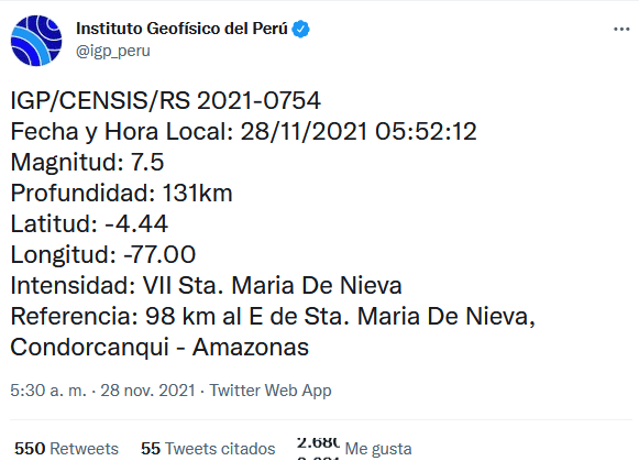 La mañana de este domingo, la selva norte de Perú y una vasta zona aledaña de la costa central del país registró un fuerte sismo de 7.5 grados. Hasta el momento, autoridades no han reportado víctimas mortales, sin embargo, sí hubo daños en algunas fincas.Según informó el Instituto Geofísico local, el terremoto se registró a las 05:52 locales (04:52 horas tiempo de México) con epicentro a 98 kilómetros al este de Santa María de Nieva en Condorcanqui, Amazonas, selva norte de Perú, a una profundidad de 131 kilómetros.La gran profundidad del sismo en la Amazonia peruana provocó que la onda expansiva fuera mayor y afectara a casi la mitad del país, en la zona norte y central, incluyendo a regiones costeñas y andinas como Cajamarca, Piura, Tumbes, Lambayeque, Ancash y Lima.La Defensa Civil indicó, en su segundo reporte, que hasta el momento no se reportan daños personales, pero sí resultaron afectadas una indeterminada cantidad de viviendas en varios distritos de la región de Amazonas.El distrito de Santa María de Nieva es una zona poco poblada donde habitan indígenas amazónicos y se ubica a las orillas del río Nieva, en la frontera con Ecuador."El movimiento ha sido inmenso, pero no tenemos heridos", dijo a la radio RPP Héctor Requejo, alcalde del distrito Santa María de Nieva, con una población de dos mil 500 habitantes.Requejo indicó que algunas viviendas de adobe y madera colapsaron por la magnitud del sismo.En la zona afectada también se registraron cortes de energía eléctrica."Nos hizo recordar el sismo que ocurrió en Ica" (sur de Perú), dijo una pobladora de la región de Amazonas al canal de televisión Latina."Hemos salido todos a la calle, estamos muy asustados", dijo a su vez a RPP una ciudadana que se identificó como Lucía y quien se comunicó por teléfono desde la ciudad de Chota, en Cajamarca, región de donde es oriundo el presidente peruano Pedro Castillo.