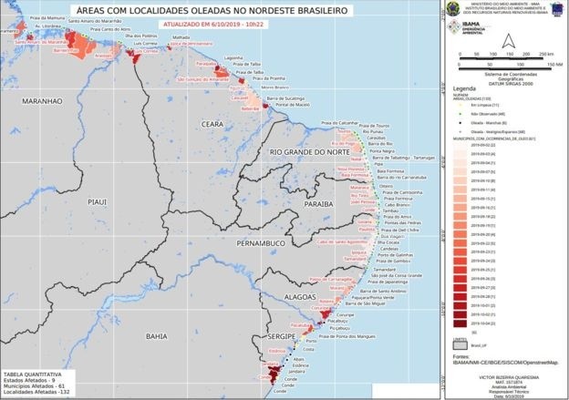 Durante el siguiente mes, el derrame se extendió a 63 localidades en nueve estados del noreste: Pará, Maranhao, Ceará, Rio Grande do Norte, Paraíba, Pernambuco, Alagoas, Sergipe y Bahía.