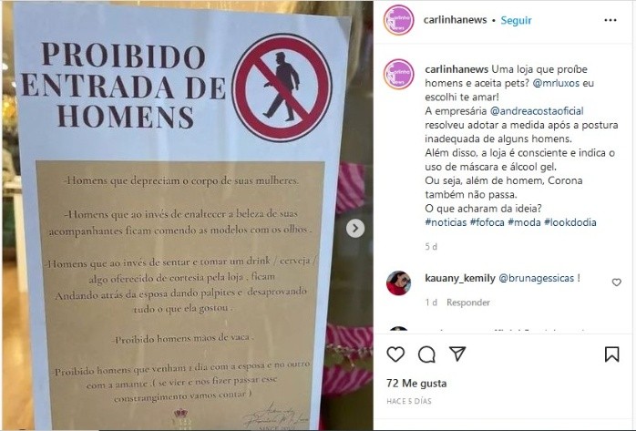 Andrea Costa asegura que su paciencia llegó al límite. Esta empresaria y modelo decidió prohibir a los hombres el ingreso a su tienda de ropa femenina en Brasil tras repetidos episodios de acoso y machismo, una medida que generó polémica."Prohibida la entrada a los hombres", dice uno de los carteles que Costa pegó en el escaparate de Mr Luxos en un centro comercial de São José dos Campos (estado de Sao Paulo), junto a un aviso que en cambio asegura: "Su mascota es bienvenida"."Hombres, por favor contribuyan en la privacidad de las mujeres, esperen en la banca fuera de la tienda", reza otro aviso.A raíz de la inusual medida y su difusión en la prensa, la tienda Mr Luxos y su propietaria fueron blanco de comentarios agresivos en las redes sociales, e incluso un sujeto fue "personalmente hasta la tienda" para rechazar la prohibición, contó este martes Costa.En el local, Costa también tiene un pequeño estudio donde ella y sus modelos se toman fotos para las ventas por Internet, momentos que atraen repetidamente las miradas lascivas de hombres que acompañan a clientas o pasan frente al escaparate, según mostró en sus historias de Instagram, donde cuenta con 263 mil seguidores."El 99.99% de los hombres tiene conductas incorrectas, es imposible descubrir (aquellos que no) con sólo mirarlos, por tanto ahora todos tienen prohibido entrar", asegura Costa, también una conocida influencer, via Whatsapp.Costa y sus empleadas han presenciado episodios de hombres intentando espiar a clientas en los vestidores o descalificando el cuerpo de sus compañeras con frases como "eso se ve horrible", "con ese escote no sales" o "estás mostrando toda tu panza".Para evitar estas situaciones, Costa reorganizó los ambientes de la tienda y asegura que hasta ofreció cerveza y videojuegos para que los hombres permanecieran lejos de los probadores y las modelos, pero no tuvo éxito.La empresaria resolvió prohibir el ingreso a hombres que "desprecian el cuerpo de sus esposas, que en vez de enaltecer la belleza de sus acompañantes se quedan comiendo con los ojos a las modelos" o que un día llegan con la esposa "y al otro con la amante (si nos hacen pasar esa vergüenza, vamos a contarlo)", enumera en uno de los carteles.Y Costa afirma que mantendrá la medida indefinidamente."Todas nosotras, mujeres, soñamos con un ambiente donde podamos cambiarnos de ropa y vernos en el espejo sin ser acosadas", reclama.JM