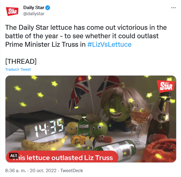 La caída de Liz Truss era un desenlace tan anticipado en el Reino Unido que uno de los chistes más comentados de los últimos días ha sido una disparatada competencia para determinar a quién le quedaba más "vida útil", a una lechuga de supermercado o a la primera ministra. Ganó la lechuga.El tabloide "Daily Star" llevó la broma hasta el punto de que llevaba una semana emitiendo en vivo durante las 24 horas un video en el que aparecía una lechuga iceberg, ataviada con peluca y gafas, junto a un retrato de la líder conservadora, que este jueves anunció finalmente su dimisión."Truss ha perdido la competencia", declaró hoy con orgullo el tabloide, que ha logrado viralizar la imagen del vegetal como metáfora de la brevedad del mandato de la política conservadora, que pasa a la historia como la primera ministra que menos tiempo ha resistido en Downing Street.Desde que la reina Isabel II la designó como jefa de gobierno el pasado 6 de septiembre, dos días antes de su muerte, han pasado solo 45 días.Gran parte de ese periodo, Truss lo ha pasado tratando de reparar el destrozo económico que provocó su agresivo recorte de impuestos, que desplomó el valor de la libra esterlina, disparó el coste de la deuda británica y obligó al Banco de Inglaterra a una intervención de emergencia para evitar la quiebra de varios fondos de pensiones.El chiste sobre la lechuga nació en realidad en las páginas del respetado semanario "The Economist". A principios de la semana pasada, su editorial subrayaba que al descontar el periodo de luto por la reina Isabel II, que paralizó la política británica, Truss solo estuvo "en control" del país durante siete días, antes de que la tormenta económica arrasara con todos sus planes."Eso es más o menos la vida útil de una lechuga", bromeaba la publicación en un artículo en el que bautizaba a la todavía líder conservadora como "La dama iceberg", en contraposición a "La dama de hierro" que Truss ambicionaba ser al frente del gobierno.OF
