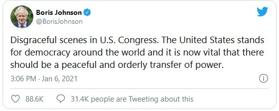 El primer ministro británico, Boris Johnson, denunció este miércoles las "escenas vergonzosas" en Washington tras la irrupción de seguidores de Donald Trump en el Congreso estadounidense, mientras Irlanda condenó una "agresión deliberada a la democracia"."Escenas vergonzosas en el Congreso estadounidense. Estados Unidos es el defensor de la democracia en el mundo entero y ahora es vital que el traspaso del poder se haga de manera pacífica y ordenada", estimó en un tuit.El Congreso de Estados Unidos suspendió el miércoles una sesión destinada a certificar la victoria del demócrata Joe Biden en las elecciones presidenciales tras la irrupción de partidarios de Donald Trump en el Capitolio.Los manifestantes entraron en las dos cámaras, Senado y Cámara de Representantes, así como en la rotonda del Capitolio, donde se usó gas lacrimógeno.Según un agente citado por el Washington Post, una mujer resultó herida de bala en el interior y fue evacuada en camilla; de acuerdo con la CNN, se encuentra en estado crítico."Estados Unidos está, con razón, muy orgulloso de su democracia y nada puede justificar estos intentos violentos por hacer fracasar la transición legal y conforme del poder", consideró el ministro de Relaciones Exteriores británico, Dominc Raab."Escenas impactantes y profundamente tristes en Washington DC que deben nombrarse por lo que son: una agresión deliberada de la democracia por un presidente saliente y sus seguidores, que intentan revertir una elección libre y legítima", condenó por su parte su homólogo irlandés, Simon Coveney."El mundo os está mirando", añadió, pidiendo una "vuelta a la calma".El primer ministro irlandés, Michael Martin, recordó "el vínculo profundo" de su país con Estados Unidos, afirmando que seguía los acontecimientos en Washington con "mucha preocupación y consternación".JM