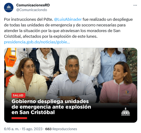 Ayer lunes comenzaron a circular en redes sociales videos que mostraban los estragos de la poderosa explosión que sacudió un importante mercado cerca de la capital, Santo Domingo, en República Dominicana. De acuerdo con la última información de las autoridades, al menos 3 personas murieron y otras más de 30 resultaron con lesiones.Según los testigos, la explosión ocurrió dentro de una panadería de la localidad de San Cristóbal, explica la agencia AP. Explican que el fuego se propagó de forma rápida a una ferretería que se encontraba a un lado y luego a una tienda de muebles. Hasta el momento se desconocen los motivos de la explosión.Videos de redes sociales muestran el grado de destrucción ocasionado por el estallido. En las grabaciones se aprecia a las personas que buscan alejarse del siniestro.La agencia AP señala que en el hecho, que tuvo lugar en un área conocida como el "Mercado Viejo", donde muchas personas acuden todos los días para comprar bienes.En un comunicado difundido durante la noche de ayer por la presidencia de República Dominicana, se dio a conocer que el gobierno del mandatario Luis Abinader ordenó el despliegue de unidades de emergencia ante la explosión en San Cristóbal "para atender la lamentable situación".El ministro de la Presidencia, Joel Santos Echavarría, quien arribó al sitio después de reportarse el estallido, indicó en ese último comunicado que hasta ese momento se había reportado la muerte de tres personas, mientras que otras 39 han sido ingresadas, 33 en diferentes hospitales del estado y otras seis en clínicas privadas. De los hospitalizados, seis fueron trasladados a Santo Domingo.OF