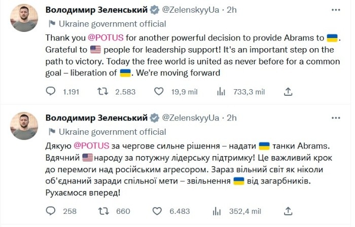 El anuncio de Estados Unidos y Alemania de que autorizarán la entrega de tanques pesados a Ucrania es un "paso importante" para la victoria del país, invadido por Rusia, afirmó el presidente ucraniano Volodimir Zelenski el miércoles.El mandatario ucraniano agradeció en Twitter a su par estadounidense Joe Biden por la "poderosa" decisión. "Es un paso importante hacia la victoria", manifestó."Hoy, el mundo libre está unido como nunca antes con un objetivo común: la liberación de Ucrania", añadió.Estados Unidos anunció el miércoles la entrega de 31 tanques Abrams a Ucrania poco después de que Alemania autorizara el envío de carros de combate Leopard.Kiev llevaba reclamándolos con insistencia para frenar el avance del ejército ruso.El jefe de la administración presidencial, Andriy Yermak, calificó el día como "histórico" y aseguró en Telegram que los tanques "decidirán" la "futura victoria" de Ucrania.JM