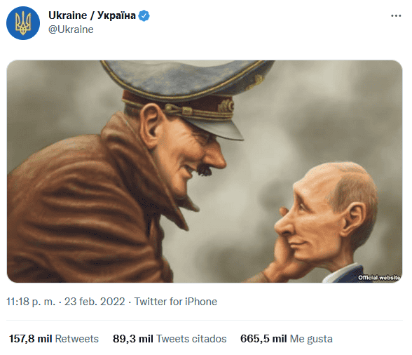 La escalada de violencia entre Rusia y Ucrania ha alcanzado un punto crítico, pero no solo militar y políticamente, sino también a través de las redes sociales.La noche del miércoles, la cuenta oficial de Ucrania en Twitter compartió una caricatura sin título o texto, en la que se ve al presidente Vladimir Putin como alumno de Hitler.La publicación ocurrió luego de que Putin informó por medio de un discurso televisivo en cadena nacional a la ciudadanía sobre el inicio de una operación militar en el este de Ucrania para "desmilitarizar y desnazificar Ucrania".Inmediatamente, los internautas lanzaron la caricatura que no muestra a su autor, pero sí se ve a un gran Hitler orgulloso, sonriente, viendo hacia abajo y tomando el rostro en una de sus manos de un diminuto Vladimir Putin, quien parece complaciente.La imagen compartida tiene hasta este momento más de 668 mil reacciones, más de 89 mil comentarios y cada segundo aumentan las muestras de apoyo por los sucesos ocurridos en dichas naciones que hasta el momento ya arroja saldo en muertos y heridos, tras los bombardeos en al menos 7 ciudades de Ucrania.OA