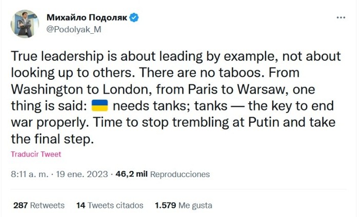 Ucrania reclamó este jueves más armas para resistir a la invasión rusa y urgió a sus aliados a "dejar de temblar" ante el presidente ruso, Vladimir Putin, la víspera de una reunión de países occidentales sobre la ayuda a Kiev.Los ministros ucranianos de Defensa y de Exteriores, Oleksii Reznikov y Dmytro Kuleba, instaron a "reforzar de forma considerable" las entregas de armas, incluyendo tanques Leopard, de fabricación alemana.Los dos ministros alegaron que Rusia conserva una ventaja cuantitativa en términos de tropas, armas y equipamiento.Rusia advirtió por su lado del riesgo de una escalada "peligrosa" si Ucrania recibe armas de largo alcance, capaces de atacar su territorio.Ese cruce de declaraciones se produjo la víspera de un encuentro en Ramstein (Alemania) de los ministros de Defensa y altos funcionarios militares del Grupo de Contacto sobre Ucrania, integrado por 52 países y liderado por Estados Unidos.Esa reunión discutirá la coordinación de la ayuda a la exrepública soviética, que desde hace casi once meses resiste a la invasión rusa, y en particular de la entrega de blindados pesados y de sistemas modernos de defensa antiaérea.El Reino Unido ya prometió 14 tanques Challenger 2 y 600 misiles adicionales del tipo Brimstone. Dinamarca informó que va a entregar a Ucrania 19 cañones de largo alcance Caesar y Suecia anunció el envío de cañones de largo alcance Archer."Es el momento de dejar de temblar ante Putin", afirmó en Twitter el consejero de la presidencia ucraniana, Mijailo Podoliak.El presidente del Consejo Europeo, Charles Michel, expresó durante una visita a Kiev su convencimiento de que Ucrania recibirá los tanques que reclama."Oímos el mensaje. Ustedes tienen necesidad de más sistemas de defensa antiaérea y de artillería y de más municiones" y en consecuencia "debe haber entregas de tanques", tuiteó Michel."Somos conscientes de que las próximas semanas podrán ser decisivas" para la evolución de la guerra, agregó el presidente del Consejo, una instancia de la Unión Europea que reúne a los jefes de Estado y de Gobierno de los 27 países del bloque.JM