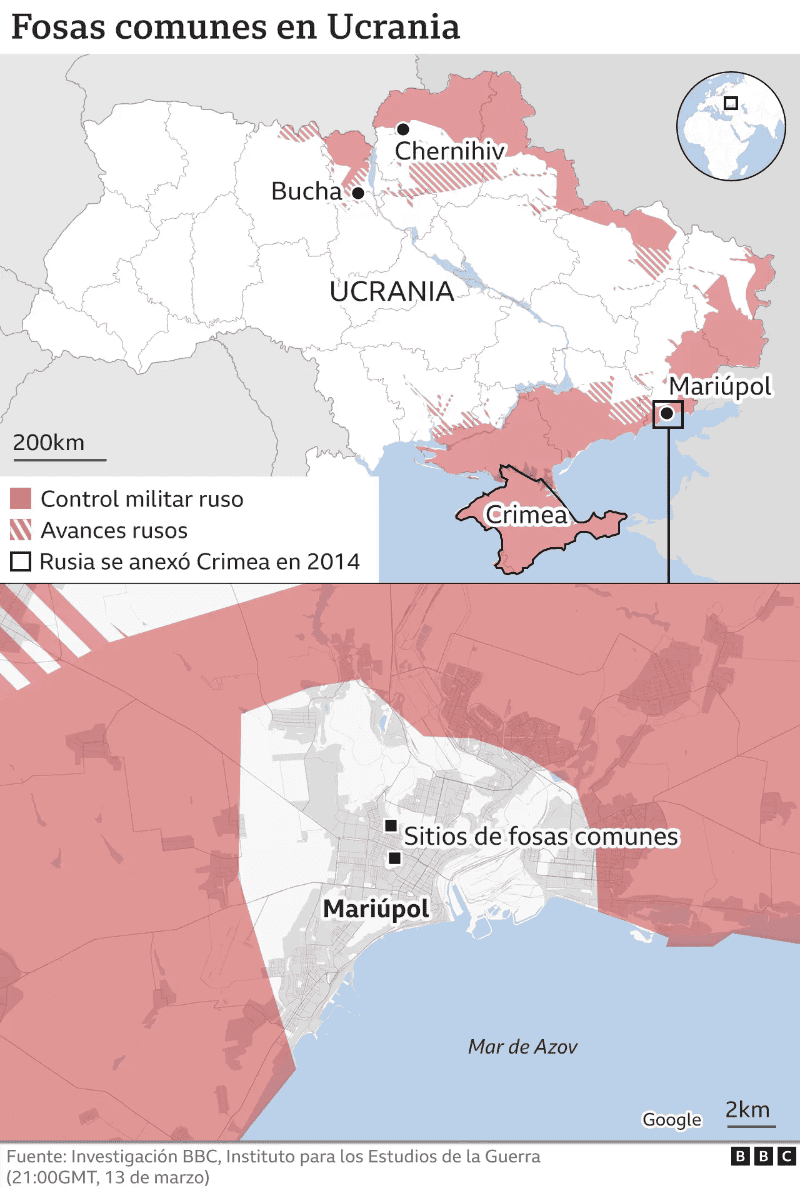 Los bombardeos rusos en algunas áreas en Ucrania han sido tan intensos que poblaciones y ciudades se están viendo obligadas a enterrar decenas de víctimas civiles, sin ningún tipo de ceremonia, en fosas comunes.El lugar donde esta oscura realidad de la guerra se refleja con mayor claridad es Mariúpol, una ciudad portuaria clave devastada por los bombardeos constantes que ha tenido que cavar varias fosas con rapidez en las últimas dos semanas."No podemos enterrar (a las víctimas) en tumbas privadas ya que están a las afueras de la ciudad y el perímetro está controlado por las tropas rusas", le dijo por teléfono a la BBC el vicealcalde de Mariúpol Serhiy Orlov.Los sitios incluyen un cementerio en desuso que ha sido reabierto, dijo Orlov.Advertencia: este artículo incluye imágenes que pueden herir algunas susceptibilidadesEste domingo, el consejo de la ciudad aseguró que la cifra de víctimas civiles había superado los 2.100. Los fuertes bombardeos rusos han evitado que se efectúe cualquier tipo de evacuación masiva en la ciudad de Mariúpol a pesar de los esfuerzos para habilitar una ruta de escape segura.Orlov no pudo dar una cifra total de civiles fallecidos que han sido enterrados en fosas comunes pero dijo que en uno de los sitios había 67 cuerpos. "Hay algunos que no han podido ser identificados pero algunos otros tenían documentos".Miles de residentes se encuentran escondidos en sótanos y, en algunos casos, las personas están enterrando familiares de manera privada en patios y jardines.Las personas encargadas de la limpieza y los equipos de reparación de vías en la maltratada ciudad estaban teniendo que recoger cuerpos de las calles, aseguró, ya que los servicios municipales han colapsado. "Algunas personas fueron asesinadas durante esas recolecciones".Casi a unos 650 kilómetros al noroccidente, en los límites de la capital Kiev, se cavó una fosa común cerca a una iglesia en la ciudad de Bucha, aseguró la legisladora local Mykhailyna Skoryk-Shkarivska. En la fosa hay más de 60 cuerpos.Andriy Levkivsky, un médico que trabajaba cerca a Irpín, publicó en Facebook un video del entierro. Los médicos enterraban a las víctimas que habían sido traídas al hospital de Irpín.Skoryk-Shkarivska le dijo a la BBC que se había llevado a cabo un "rito ceremonial" en el hospital antes del entierro. No todas las víctimas habían sido identificadas y "nadie sabe con exactitud dónde están los familiares", aseguró."Ahora estamos discutiendo con los voluntarios cómo crear un sistema digital para identificar a las personas y encontrar a los familiares", dijo.Las tropas rusas capturaron el hospital el sábado y les dijeron a los médicos que se fueran, contó Skoryk-Shkarivska en una conversación telefónica desde Ucrania. Agregó que la población de Bucha y la mitad de Irpín están controladas por Rusia.El regreso de las fosas comunes ha generado impacto para los ucranianos.Muchos aún tienen recuerdos amargos de la Segunda Guerra Mundial, época en la que los nazis asesinaron judíos y partidarios soviéticos, y la ocurrencia del Holodomor, una hambruna generada por la confiscación soviética de granos y ganado en los años 30."Mi tío tiene 92 años e incluso lo comparó con su niñez durante la guerra", dijo Skoryk-Shkarivska, enfatizando que es "importante para nosotros enterrar a nuestros familiares de manera tradicional, de la manera cristiana, con oración"."Incluso ahora, en la guerra, las personas a veces piden a los sacerdotes hacerlo", dijo.Las ciudades de Járkiv, Chernihiv y Sumy, al norte de Ucrania, están rodeadas por tropas rusas y los bombardeos incesantes han causado la muerte a muchos civiles allí también.El 6 de marzo, Oleksandra Matviichjuk, una activista por los derechos civiles, publicó en su Twitter una foto de féretros en una trinchera, con el mensaje: "Y así se entierra a los civiles asesinados en el bombardeo ruso de Chernihiv en trincheras. Como el principal cementerio de la ciudad, en Yatsevo, está bajo bombardeos constantes de los ocupantes rusos, las víctimas están siendo enterradas en el bosque Yalivschyna".Aleksandr Lomako, secretario del consejo de la ciudad de Chernihiv, le dijo a la BBC que las víctimas de los bombardeos aéreos rusos estaban siendo enterradas en un cementerio temporal. Confirmó que ya no se podía acceder al cementerio principal de la ciudad, ya que las tropas rusas tienen la ciudad rodeada por tres flancos y el cementerio más cercano está a casi 10 kilómetros de distancia."Después de la guerra volveremos a enterrar a los muertos", dijo, estimando el número de civiles muertos en el bombardeo ruso en aproximadamente 200.Un bombardeo aéreo mató 45 personas en Chernihiv, la peor cifra, dijo Lomako, agregando que los bombardeos nocturnos estaban matando siete personas en promedio por noche."Los aviones dejan caer entre tres y cuatro bombas en bloques residenciales. Además, una cayó en el hospital pero aún está en funcionamiento. Decenas de bloques residenciales han sido destruídos en los límites de la ciudad".Al igual que la evidencia de entierros masivos, hay relatos de tumbas improvisadas.Una madre y su hijo fueron enterrados en el jardín de su nuevo bloque de apartamentos en Irpín, el cual fue intensamente bombardeado por los rusos. Una foto de la tumba fue compartida de manera masiva por los ucranianos, y un tweet de la periodista Olga Rudenko mostraba a Marina Met y su hijo Iván disfrutando de la vida en Kiev antes de la invasión.Para aquellos quienes tienen familiares que han sufrido los efectos del cerco y los bombardeos a manos de las fuerzas invasoras, sin duda las tumbas improvisadas se sentirán como la indignación final.Ahora puedes recibir notificaciones de BBC Mundo. Descarga la nueva versión de nuestra app y actívalas para no perderte nuestro mejor contenido.JM