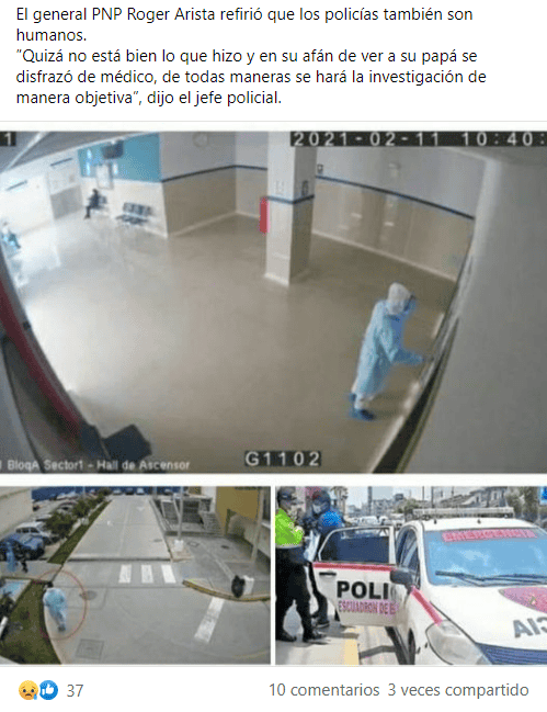 El pasado 11 de febrero un joven policía ingresó disfrazado de médico al hospital Daniel Alcides Carrión, en Huancayo (Perú) con el objetivo de visitar a su padre enfermo de COVID-19 luego de que no se le brindara información alguna al respecto, sin embargo, al llegar a su habitación lo encontró sin vida; autoridades del nosocomio y de la corporación procedieron al reporte y detención.Mediante un comunicado, el hospital dio a conocer que el paciente a quien visitaba el policía había ingresado el pasado 9 de febrero de 2021 con un cuadro avanzado de COVID-19 y diabetes no controlada , por lo que se procedió a subirlo al piso correspondiente, sin embargo, la lista de espera para camas con asistencia respiratoria, que incluía a una docena de pacientes, impidió su inmediata atención.En el mismo comunicado también se deslinda de los señalamientos y críticas que hacen algunas personas con respecto a la atención que el nosocomio brinda a pacientes enfermos de COVID-19 y que coadyuvará a los requerimientos de las autoridades para deslindar responsabilidades del personal que labora en la institución. En redes sociales circulan imágenes del momento en el que el policía de 21 años de edad ingresa al área COVID-19 del hospital y cómo momentos después es detenido por la policía, que además informó a medios locales que, pese a las razones que el elemento tuvo para hacerlo, su actuar no fue el correcto y se realizará la investigación pertinente:”Quizá no está bien lo que hizo y en su afán de ver a su papá se disfrazó de médico, de todas maneras se hará la investigación de manera objetiva”, informó el jefe de la policía.Al debate se han sumado decenas de usuarios que han manifestado su empatía por el policía, pues critican que el sistema hospitalario también se encuentra rebasado en el tema de información sobre pacientes y el trato que dan a sus familiares que necesitan conocer su estado de salud.