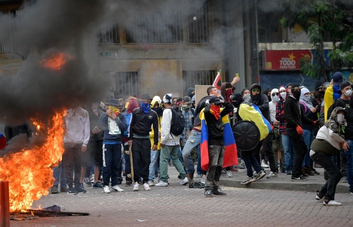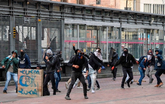 Los colombianos reactivaron con fuerza este martes las protestas contra el gobierno de Iván Duque con marchas y bloqueos de vías en ciudades como Bogotá, donde estallaron disturbios que dejaron al menos diez lesionados y 62 detenidos.La policía enfrentó con gases lacrimógenos, granadas aturdidoras y chorros de agua a encapuchados que lanzaron piedras y generaron destrozos, según observaron reporteros de la AFP.La movilización congeló el tráfico en varios puntos de la capital colombiana. Antes de caer la noche, los manifestantes hicieron sonar cacerolas y los uniformados bregaban para restablecer el orden en una zona céntrica próxima a la sede de gobierno. La alcaldía de Bogotá reportó en un comunicado 19 puntos de concentración, en algunos de los cuales registraron disturbios protagonizados por "una minoría de manifestantes".Al menos cinco policías y cinco civiles resultaron heridos en los choques, informó el secretario de Gobierno, Luis Ernesto Mejía.Además, 62 personas quedaron bajo arresto por "actos de vandalismo y por agresiones a miembros de la fuerza pública", agregó. Seis estaciones del sistema de transporte masivo Transmilenio sufrieron daños.En el centro de Bogotá, Flor Calderón, de 60 años y propietaria de un hostal, se interpuso entre los manifestantes y el Escuadrón Móvil Antidisturbios (Esmad), que le impedía el paso a la protesta."Esto es una lucha para ustedes y los hijos de sus hijos, porque el país está muy mal como va", imploraba a los uniformados con una bandera blanca.La mujer dijo a la AFP que volvió a salir a la calle en repudio por la "masacre" de líderes sociales. Además "la educación es pésima; la salud es pésima, entonces por eso estoy acompañando a estos jóvenes", agregó.En otras ciudades como Cali y Medellín también se registraron disturbios.JM