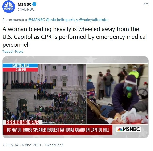 Una persona resultó herida de bala en el asalto de seguidores del presidente Donald Trump este miércoles al Capitolio estadounidense, según confirmaron fuentes de los servicios de emergencia al canal local del Distrito de Columbia de Fox. Los manifestantes también han realizado destrozos en el recinto legislativo en Washington, DC.Imágenes de MSNBC mostraron a una mujer siendo trasladada en camilla con una fuerte hemorragia y algunos legisladores fueron escuchados gritando "se han producido disparos", al tiempo que miembros de la seguridad del Capitolio desenfundaron armas en el salón de plenos de la Cámara de Representantes. El Capitolio cerró sus puertas con los legisladores en el interior, luego de que se produjeron choques violentos entre partidarios de Trump y la policía, lo que obligó a retrasar el proceso constitucional para confirmar la victoria de Joe Biden en las elecciones de noviembre pasado.Trump había instado a sus seguidores a congregarse en Washington para protestar por la aprobación formal de la victoria de Biden por parte del Congreso. Los manifestantes ingresaron a ambas cámaras, así como a la rotonda del Capitolio, donde se utilizó gas lacrimógeno.Los oficiales de policía del Capitolio sacaron sus armas para defender a los legisladores, según el congresista demócrata Dan Kildee, quien denunció un "ataque a Estados Unidos". Los legisladores fueron evacuados del edificio.La cadena CNN reportó que varios manifestantes rompieron ventanas para entrar.Varias decenas de ellos deambulan por los pasillos, gritando: "¿Dónde están?". Algunos estaban también en las galerías para visitantes.Con información de AFP/AP/EFEIM