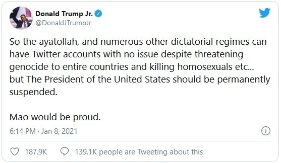 Los simpatizantes de Donald Trump, expulsado de Twitter y otras grandes redes sociales, están indignados y denuncian censura pero, de momento, sus opciones para hacerse escuchar son muy limitadas."La libertad de expresión murió y está controlada por jefes izquierdistas", dijo Donald Trump Jr; hijo del presidente saliente."¿Quien será el próximo en ser silenciado?", se preguntó Rudy Giuliani, abogado personal de Trump y el secretario de Estado Mike Pompeo alzó su voz contra "la izquierda"."Tristemente, esta no es una táctica nueva de la izquierda. Trabajaron durante años para silenciar las voces de quienes se le oponen", afirmó.El influyente senador republicano Ted Cruz calificó de "absurdas y profundamente peligrosas" las decisiones de las redes sociales."¿Por qué un puñado de multimillonarios de Silicon Valley tiene el monopolio del discurso político?", se preguntó.Paradójicamente, las reacciones fueron expresadas en Twitter, la red social preferida por Trump y que lo expulsó el viernes por considerar que sus mensajes incitan a la violencia.La decisión de Twitter fue tomada dos días después de que partidarios de Trump irrumpieran en el Capitolio de Washington en donde protagonizaron enfrentamientos con los agentes de seguridad y vandalizaron el edificio. Cinco personas, entre ellas un policía, perecieron a causa de los incidentes.Facebook y otras redes como Instagram, Snapchat o Twitch suspendieron por tiempo indeterminado las cuentas de Trump.La plataforma de debates Reddit, normalmente bastante permisiva, cerró el viernes un foro de fanáticos del presidente por haber transgredido sus normas contra la incitación al odio.JM