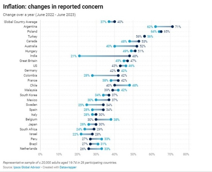 La inflación es el mayor problema económico y social para el 40% de los consultados en un sondeo que incluyó a unos 30 países y reveló que, tanto en las economías en desarrollo como en las más industrializadas del mundo, las personas comparten temores a la hora de apoyar la cabeza en la almohada.Según la encuesta What Worries the World (Lo que preocupa al mundo), que realiza la consultora Ipsos periódicamente desde hace varios años, la inflación ya lleva 15 meses como la principal situación de desvelo a nivel mundial, a junio de 2023.La aceleración de los precios fue la mayor preocupación en naciones con situaciones económicas tan disímiles como Argentina, Australia, Canadá, Francia, Alemania, Gran Bretaña, India, Polonia, Singapur, Estados Unidos y Turquía.En México, la inflación se ubicó en el segundo lugar de los principales temores sociales, mientras que en Colombia compartió el primer puesto junto al desempleo.En la más reciente actualización del sondeo, realizado entre el 26 de mayo y el 9 de junio de 2023, el público coincidió en los cinco problemas sociales y políticos más acuciantes, de 18 totales: Dos quintas partes de las personas (40%) señalaron que la aceleración de los precios es el principal problema que afecta a su país. En febrero pasado, la inflación alcanzó el nivel más alto de preocupación registrado, con un 43%.Los cinco países más preocupados por este tema el mes pasado fueron Argentina (71%), Polonia (65%), Singapur (56%), Turquía (56%) y Canadá (53%), según arrojó el sondeo.En México, se redujo 4 puntos porcentuales, al 38%, de acuerdo a las últimas cifras informadas por Ipsos. Los temores en torno a la pobreza y la desigualdad social ocuparon el segundo lugar de la lista total de 18 preocupaciones mundiales, con un 31% de las consideraciones entre los encuestados de junio.Indonesia (44%) fue el país más angustiado por la desigualdad en el último sondeo, mientras que Brasil (40%), Japón (35%) y Países Bajos (33%) la tuvieron como su principal preocupación. En México se ubicó en el cuarto lugar de las inquietudes centrales manifestadas, con un 37%.La preocupación por la delincuencia en sus países se mantuvo como central para casi tres de cada 10 encuestados (29%).Aunque en descenso, Chile (62%) todavía tuvo en junio al crimen como su mayor temor, al igual que Perú (60%), Suecia (55%) e Israel (46%), donde aumentó 8 puntos porcentuales desde el mes previo.La desocupación pasó a ser la cuarta mayor preocupación de la encuesta What Worries the World, con un 27% de predilección entre los consultados, que la llevaron a ese lugar ante una retracción en la intranquilidad por la corrupción.La última actualización del sondeo reveló que Sudáfrica es el país más preocupado por el desempleo desde abril de 2021. "Siete de cada diez sudafricanos (70%) lo consideran una preocupación, 2 puntos porcentuales más que en mayo de 2023", reveló Ipsos, que aclaró que se trata del nivel más alto registrado en la encuesta para cualquier nación.Entre los mexicanos, la inquietud social por la falta de empleo también subió en junio respecto del mes previo, en su caso 3 puntos porcentuales al 37%; mientras que entre los colombianos sondeados cayó 7 puntos al 42%.A la hora de responder sobre los temas que más le preocupan en sus países, el 25% de los encuestados respondió que la corrupción financiera y política era lo que más los intranquilizaba.La cantidad de personas afectadas por este tema disminuyó 2 puntos porcentuales comparado con la encuesta de mayo, lo que llevó a la corrupción al quinto puesto entre los 18 problemas que más inquietan a la población.En tanto, un 17% por ciento de los consultados manifestó temores respecto del cambio climático, que sigue siendo la séptima mayor preocupación a nivel mundial después de aumentar 1 punto porcentual en relación con el mes pasado en el sondeo de Ipsos.Además, la inquietud por el coronavirus, que hace un par de años centralizaba los debates sobre riesgos mundiales en medio de la pandemia de COVID-19, permaneció en el puesto 17 de 18, con apenas un 6% de las menciones.El monitor acerca de cómo ven las personas que se encaminan sus naciones no ha cambiado en el mes de junio, cuando "casi dos quintas partes (38%), en un promedio global de países, piensan que su país se dirige en la dirección 'correcta'".Entre los mexicanos consultados, el 54% consideró que su país va "en la dirección correcta", frente a un 46% que señaló que está en el camino equivocado.
