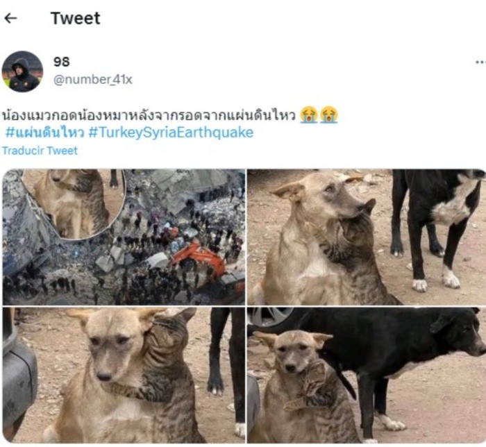 A través de las redes sociales se hizo viral una tierna imagen que surgió de la tragedia que están viviendo en Turquía y Siria tras el fuerte terremoto que sacudió a ambos países.En la imagen está un gato abrazando a un perro tras ser rescatados de entre los escombros de una casa en Siria, de acuerdo con datos surgidos de redes sociales, en específico de la cuenta de Twitter llamada Sport Dog Fórmula TopLine, causándoles emoción a los usuarios en redes sociales. La tierna postal ha desatado millones de comentarios en la red social, incluso calificándola como una de las imágenes más hermosas que han surgido del desastre natural que azotó dicha región del mundo.Algunos comentarios aseguran que el gato está abrazando al perro, sin embargo, otras mencionan que en caso de que el gato estuviera buscando refugiarse en el perro, el gato se pondría entre sus patas.Este viernes se informó que los equipos de rescate rebuscaban entre los escombros casi 100 horas después del masivo terremoto que golpeó Siria y Turquía, uno de los más mortíferos de la región con más de 23 mil víctimas hasta el momento.CR
