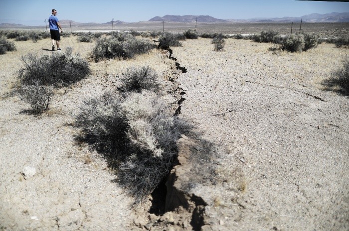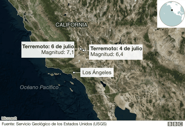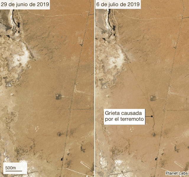 Es una grieta en el desierto que se puede ver desde el espacio.Y surgió como consceuencia del terremoto que golpeo a California el pasado viernes, el más fuerte en dos décadas.El sismo de magnitud 7.1 sucedió a una profundidad de solo 900 metros, creando una fisura cerca de su epicentro a unos 240 km al noreste de Los Ángeles.Se sintió tan lejos como Phoenix, Arizona, a más de 560 de distancia.Otro fuerte terremoto de magnitud 6.4 había golpeado cerca de la zona el día anterior.Ambos sismos causaron heridos leves y provocaron daños en viviendas, tuberías de agua y carreteras.La grieta en el desierto se abrió cerca del epicentro del terremoto próximo a la ciudad de Ridgecrest.Imágenes del antes y el después del sismo fueron publicada por Planet Labs, una compañía privada de satélites de observación de la Tierra basada en San Francisco, Estados Unidos.Según un tuit de Will Marshall, director ejecutivo de Planet Labs, los patrones en la arena sugieren que el agua fue succionada desde el suelo en un proceso llamado "deshidratación".El lunes, el presidente de Estados Unidos, Donald Trump, aprobó un pedido del gobernador de California, Gavin Newsom, para declarar el estado de emergencia en el área afectada por los sismos y desbloquear fondos adicionales.Los sismólogos advierten sobre la posibilidad de que se produzcan más movimientos.La magnitud del último terremoto alimentó la discusión sobre la preparación de California para el "Big One" como se conoce en inglés a un terremoto catastrófico que, según los sismólogos, ya tendría que haber sucedido en la falla de San Andrés.El gobernador Newsom dijo a los periodistas que esto es "una llamada de atención para el resto del estado y otras partes de la nación".California se encuentra en el proceso de instalar un sistema de detección temprana de terremotos en todo el estado que se completará en 2021.El sistema alertará a la población de que se va a producir un sismo y, entre otras cosas, detendrá los trenes y abrirá las puertas de las estaciones de bomberos momentos antes de que se produzca el sismo.***Recuerda que puedes recibir notificaciones de BBC News Mundo. Descarga la última versión de nuestra app y actívalas para no perderte nuestro mejor contenido.¿Ya conoces nuestro canal de YouTube? ¡Suscríbete!